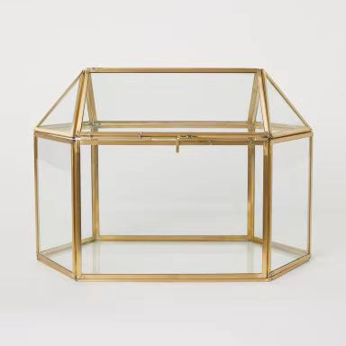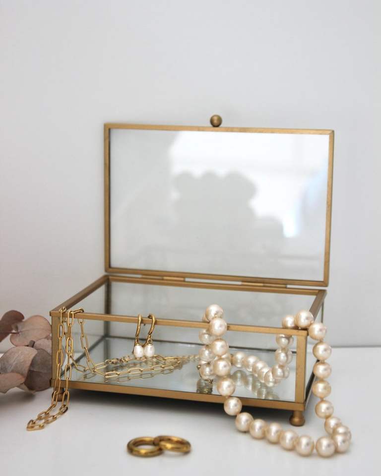 Boîte à bijoux en métal doré et en verre, rangement spacieux, panneaux en verre transparent, design élégant, parfait pour la décoration de la maison