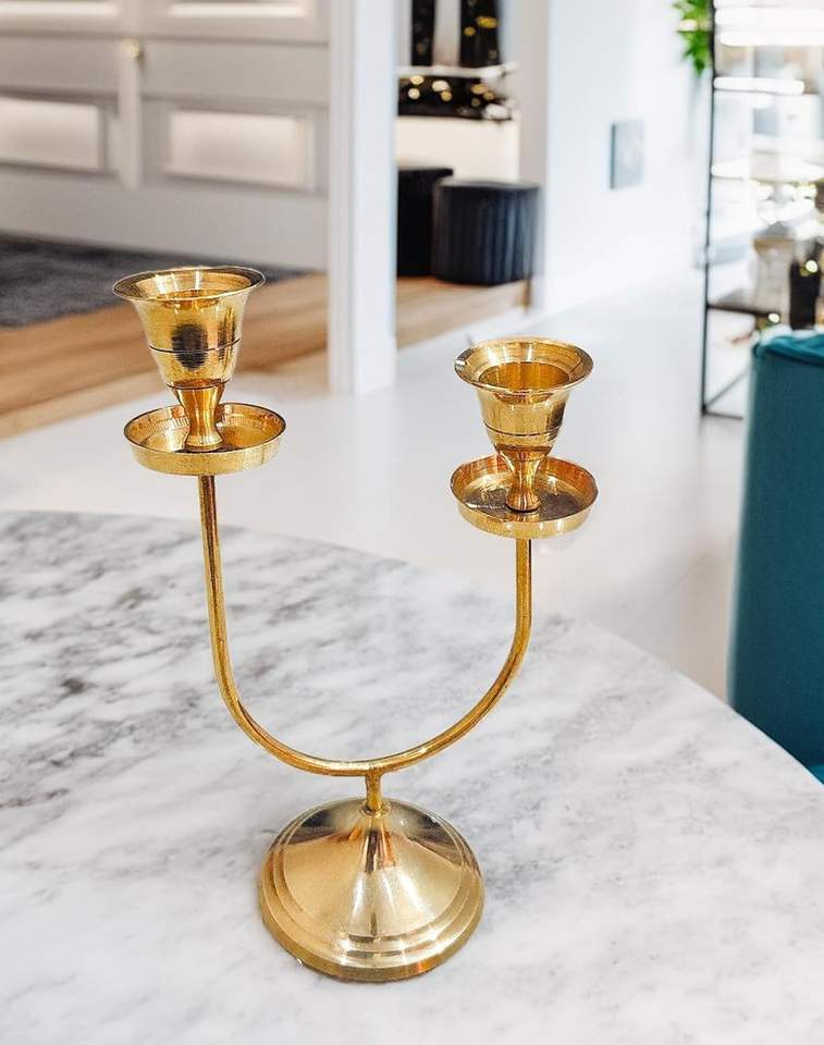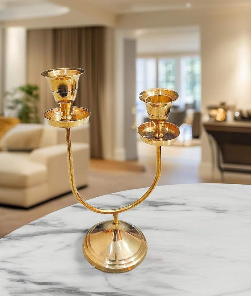 Support de bougie à deux bras en métal doré, fait main, écologique, durable, centre de table décoratif, élégant, décoration d'intérieur