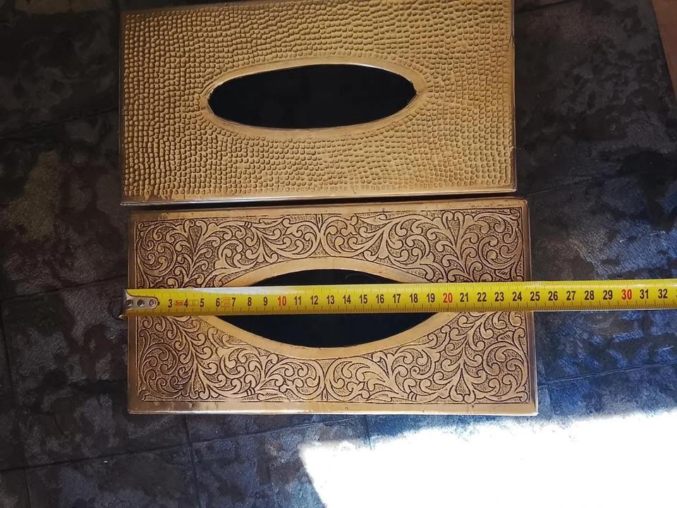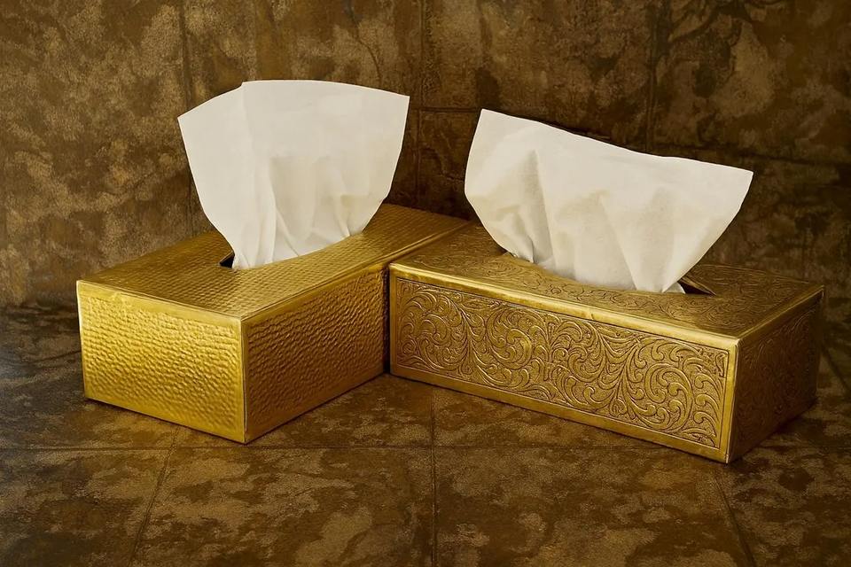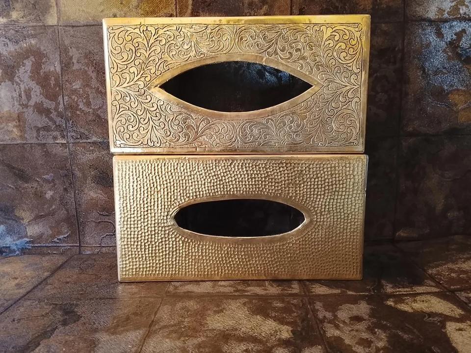 Boîte à mouchoirs en métal doré, design vintage, motif gravé, élément élégant et fonctionnel pour les tables à manger, les tables d'appoint et les événements.