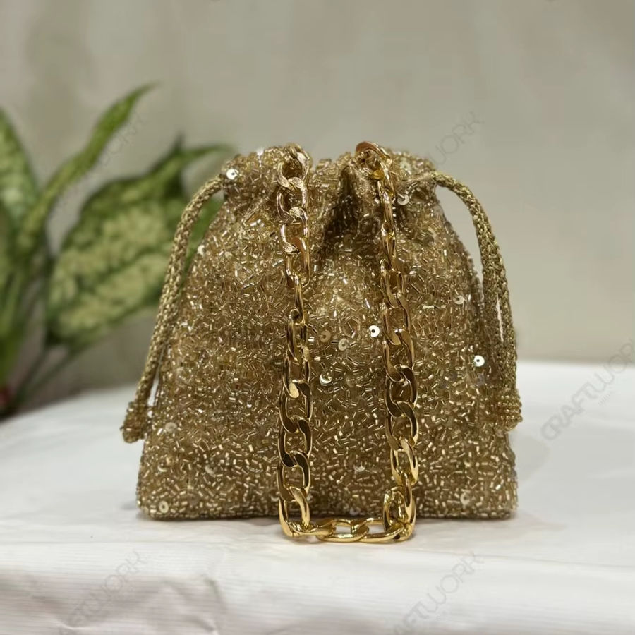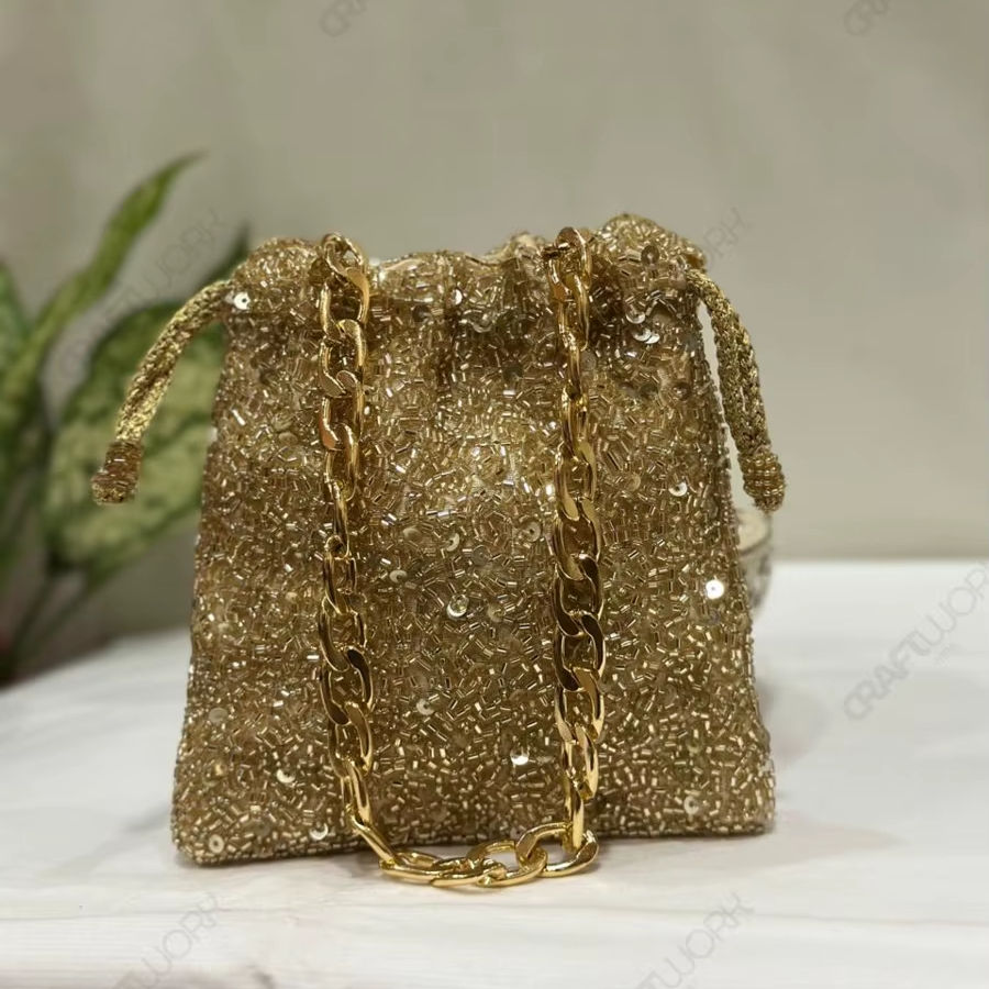 Sac seau micro-perlé doré avec chaîne décorative, accessoire de soirée compact pour femme