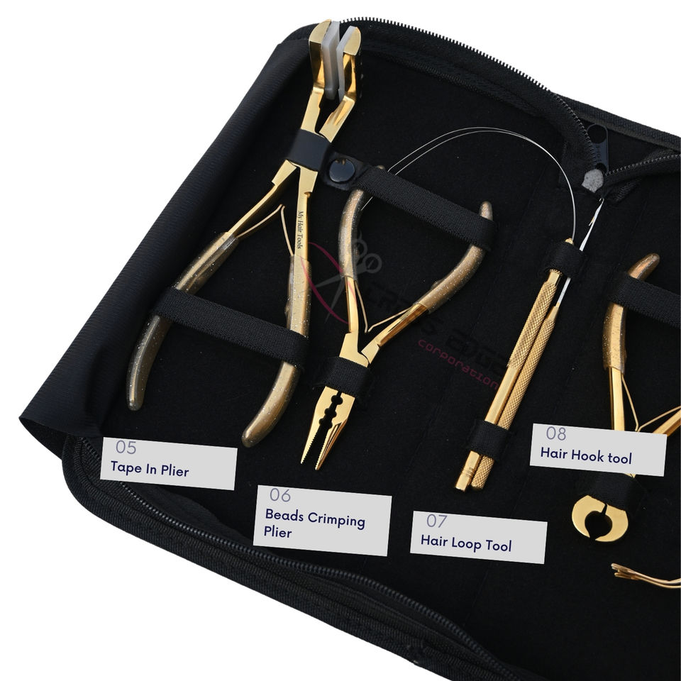 Kit d'outils pour extensions de cheveux avec micro-anneaux et bandes adhésives, comprenant des pinces en acier inoxydable, un coupe-fil et des accessoires d'installation