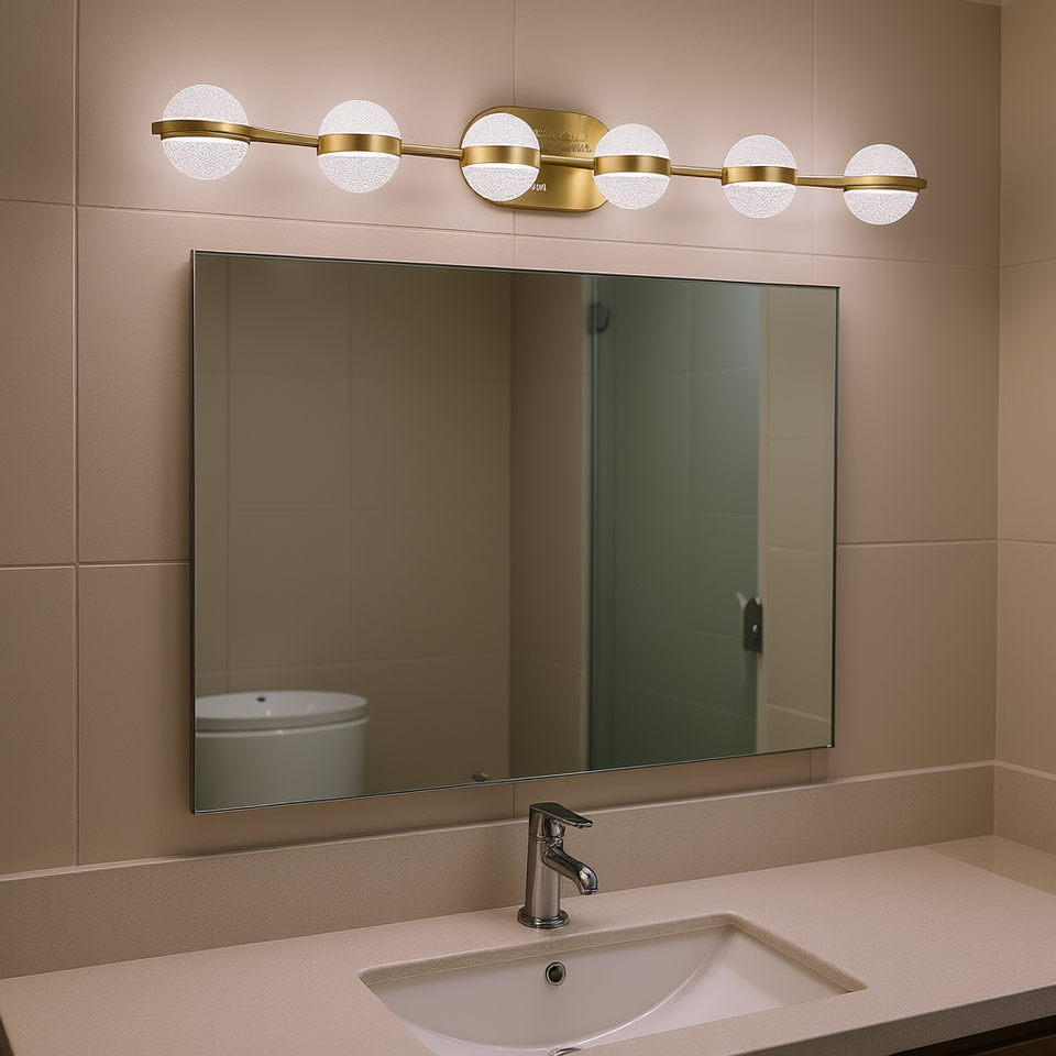 Luminaire de salle de bain LED minimaliste doré à 6 lumières, applique murale blanc chaud pour miroir, finition chrome poli