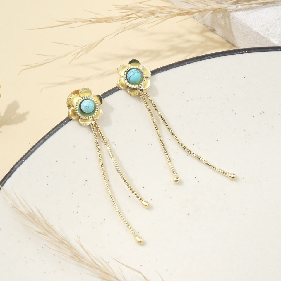 Gold-Plated Brass Flower Drop Earrings with Turquoise Stone | Handmade Minimalist Women's Long Tassel Jewelry