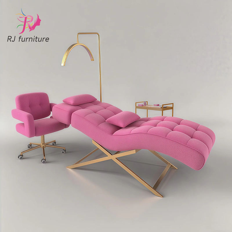 Lit de soin pour cils avec base métallique en forme de croix plaquée or, tête réglable, adapté aux traitements du visage et des cils, aux cliniques de spa