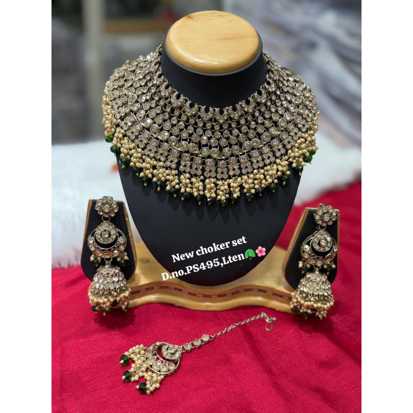 Products Name:Gold-Plated Bridal Shadow Choker Set with Earrings & Maang Tikka