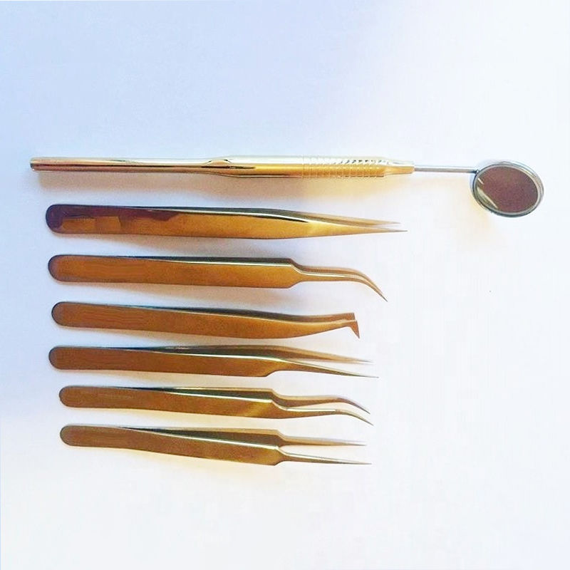 Pince à épiler d'extension de cils plaquée or avec poignée en miroir prix de gros de haute qualité sept pièces personnalisation de prix bon marché