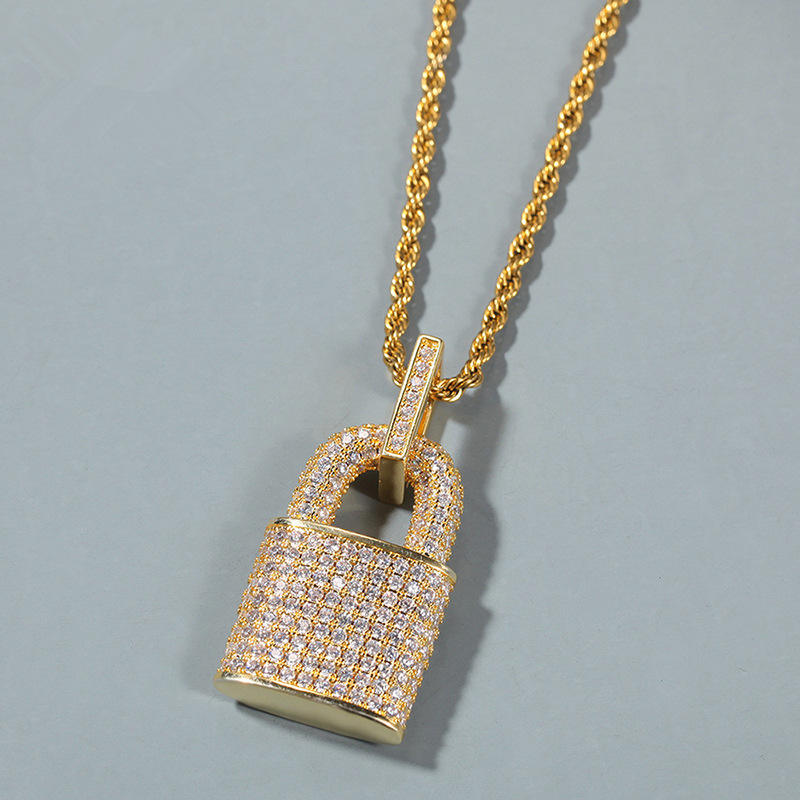 Collier pendentif cadenas plaqué or avec zircons cubiques sertis pavé, chaîne corde style hip-hop, bijoux de mode unisexe