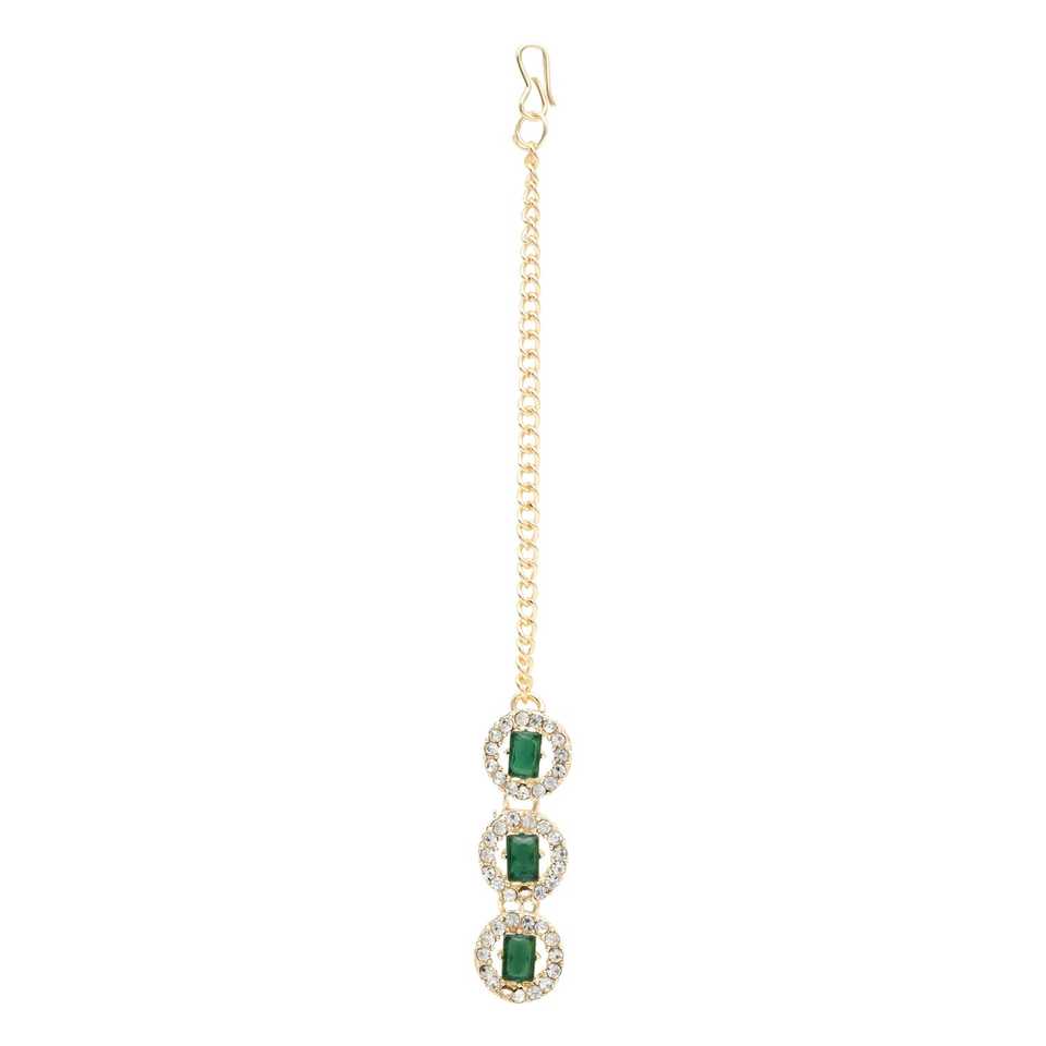 Gold Plated Multi-Layer Necklace Earrings and Maang Tikka Set Stylish Crystal Diamond Design Women's Fine Jewelry (IJ403G)