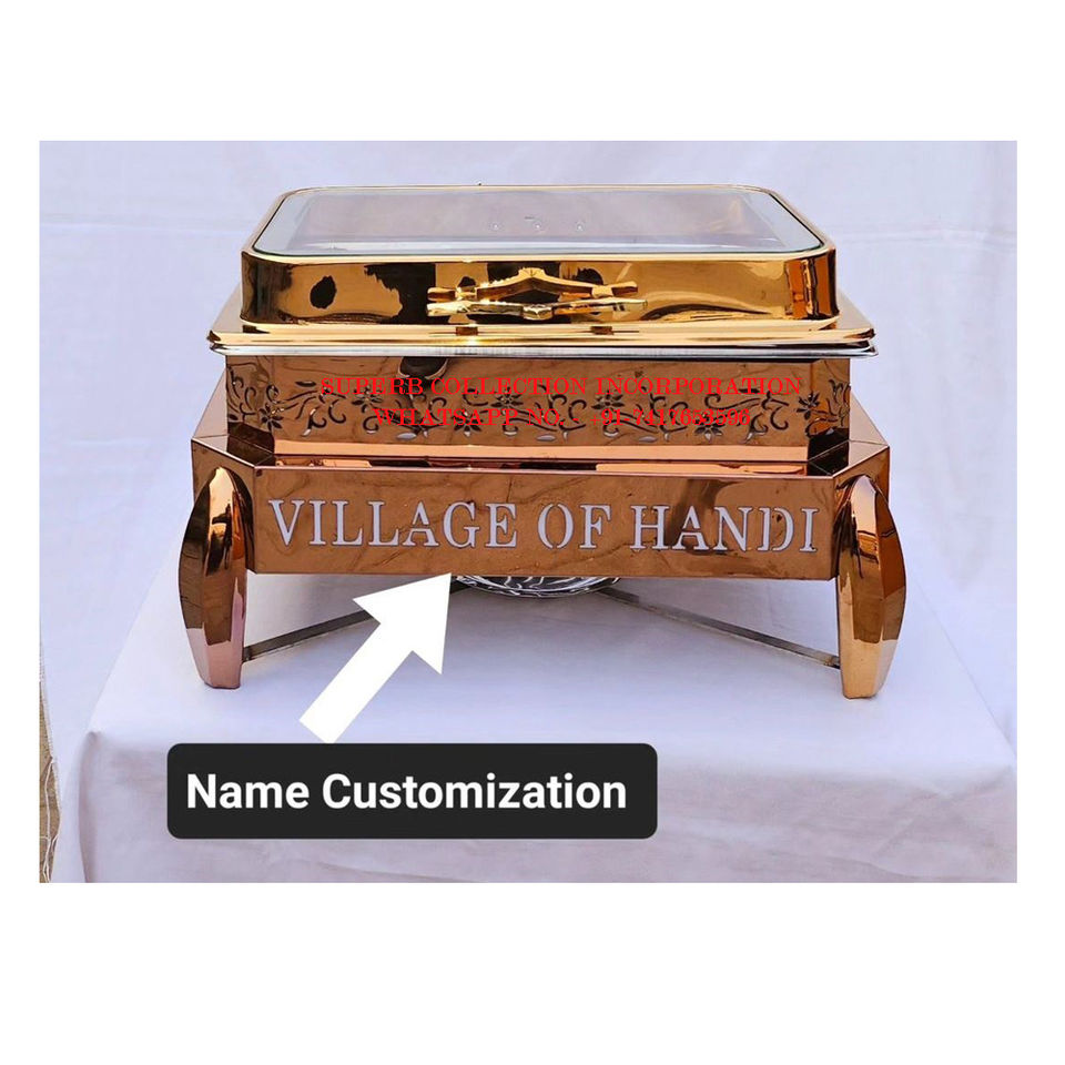 Réchaud rectangulaire plaqué or avec couvercle en verre gravé avec nom personnalisé et motif décoratif pour buffet d'hôtel et restauration