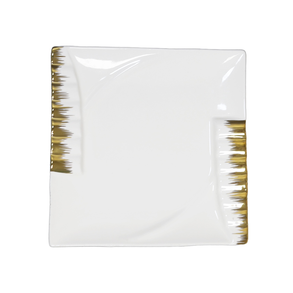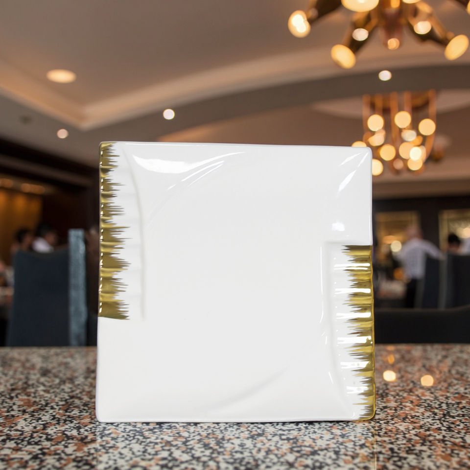 Assiettes carrées en céramique à bord doré, vaisselle en porcelaine pour mariages, hôtels et fêtes, vente en gros à prix réduit, sous-assiettes.