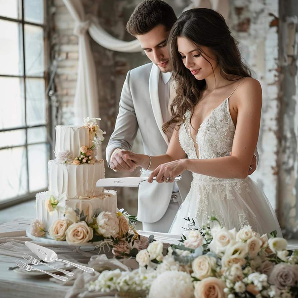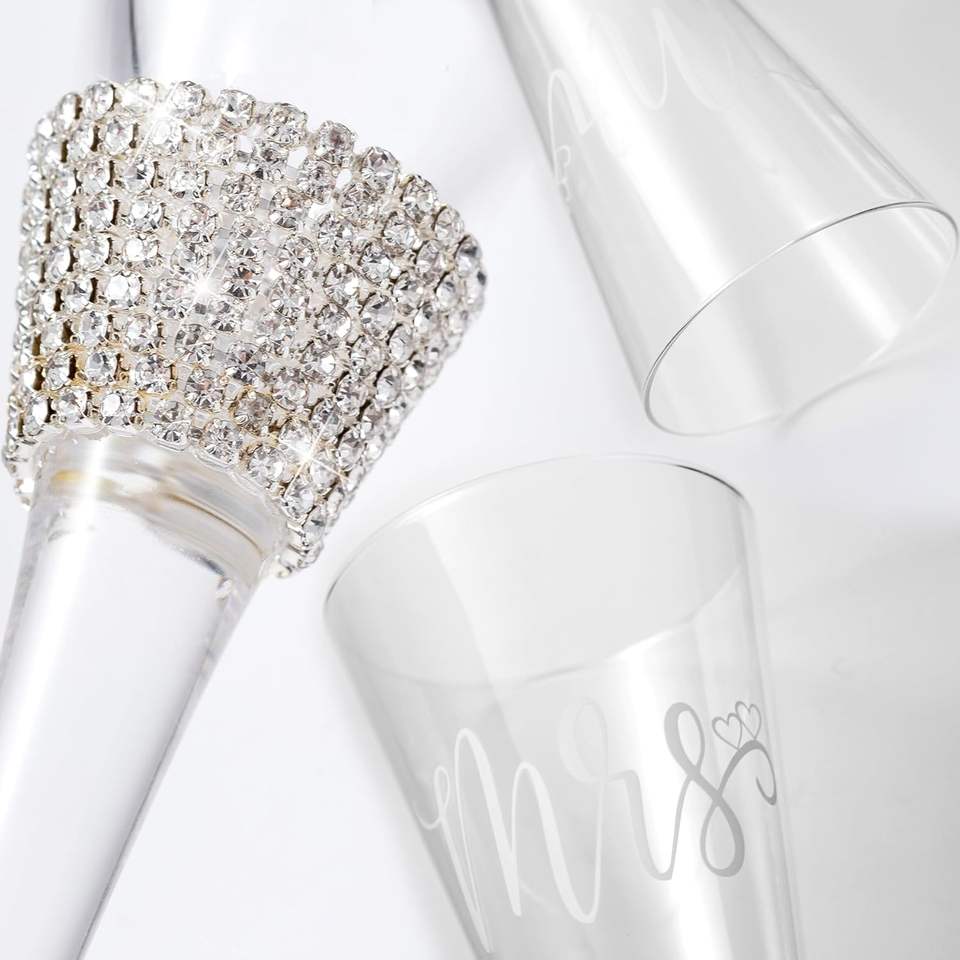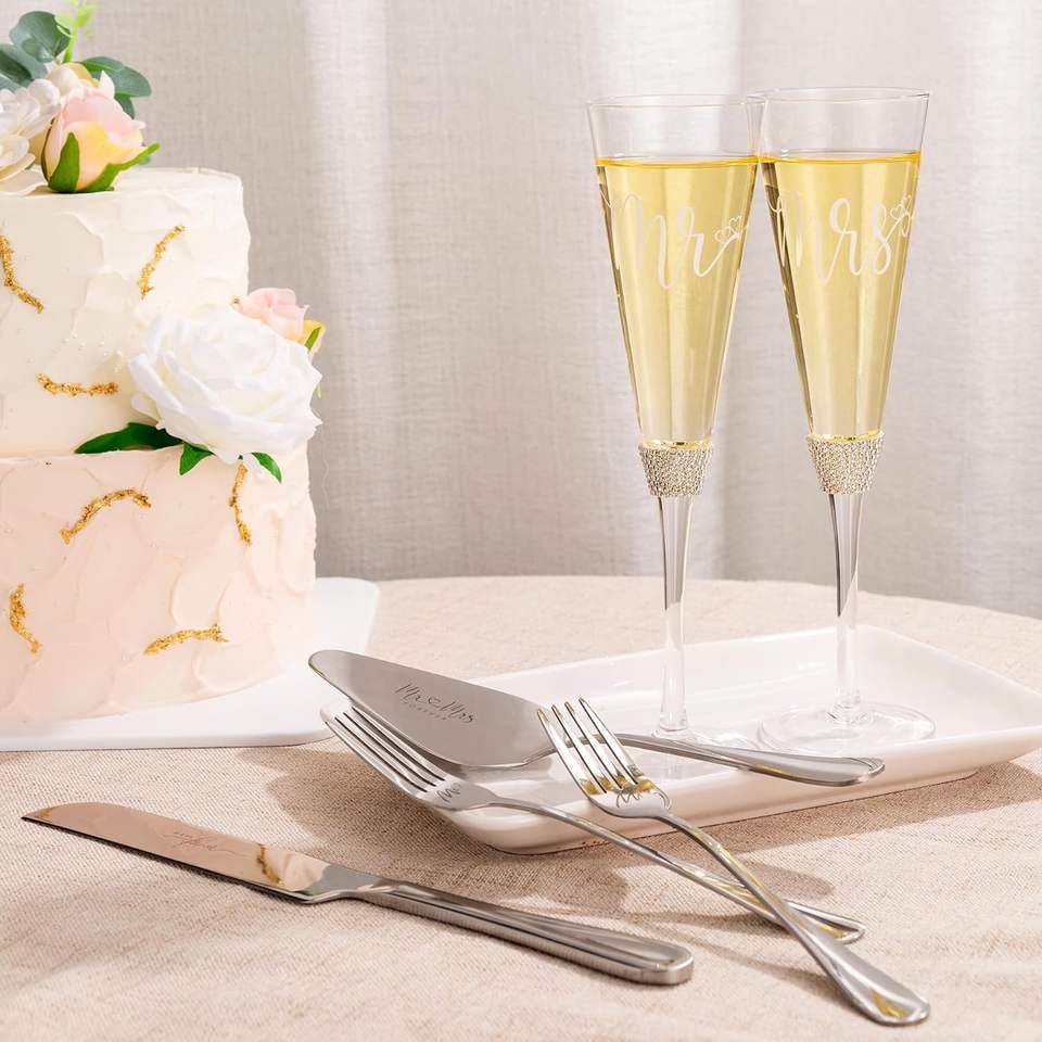 Ensemble de couteau et fourchette à gâteau de mariage dorés avec figurines mariés, verres à champagne, coupe-gâteau MR/MRS et flûtes à champagne pour cadeau