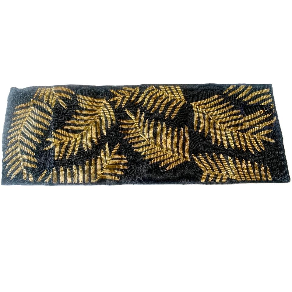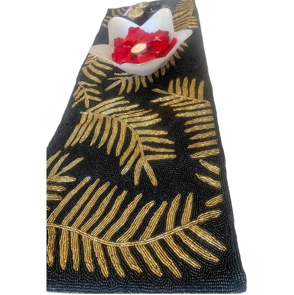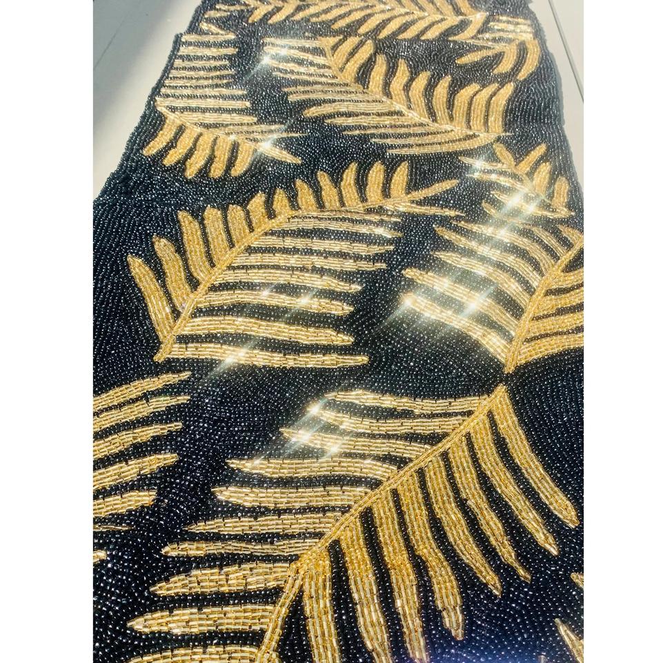 Golden Black Beaded Embroidered Table Runner Leaf Design Tropical Decor for Home Hotels Weddings Christmas-Cotton Material
