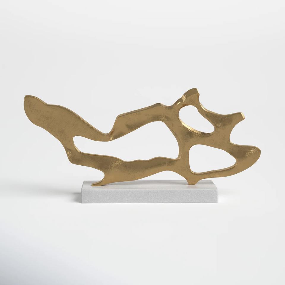 Sculpture abstraite Golden Drift, figurine moderne en fer doré, base en marbre blanc, forme géométrique contemporaine, accent décoratif