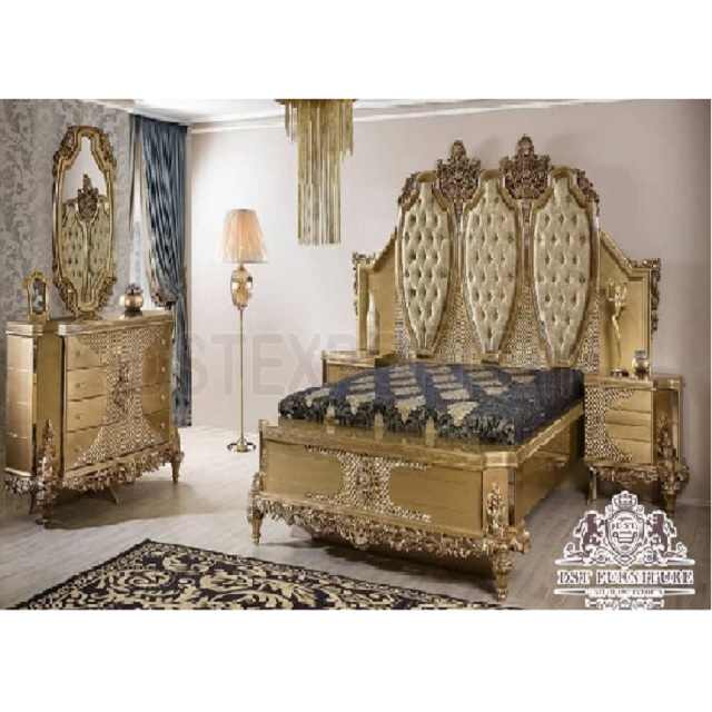 Lit double en bois massif à dossier haut doré, sculpté à la main en teck, ensemble de chambre principale de luxe, taille California King, personnalisable, DST EXPORTS