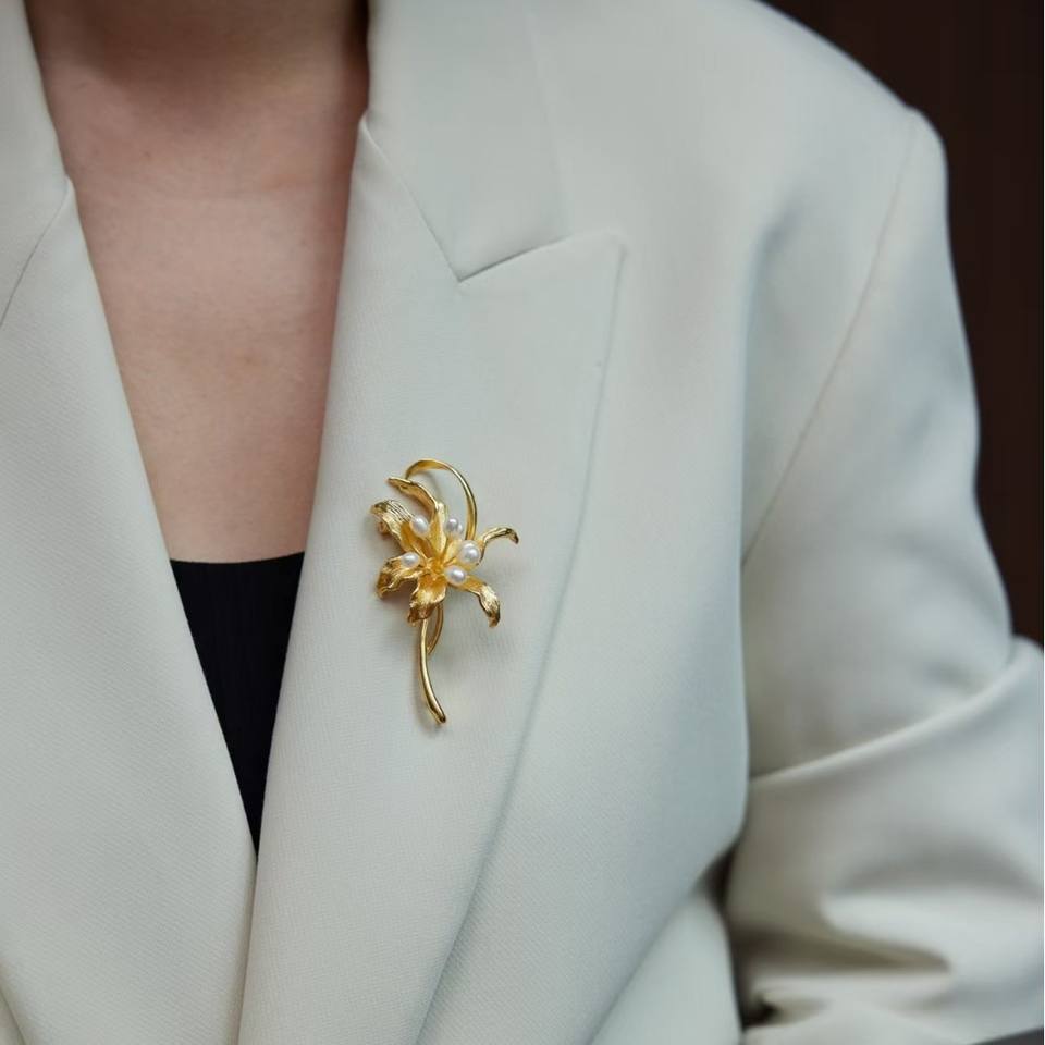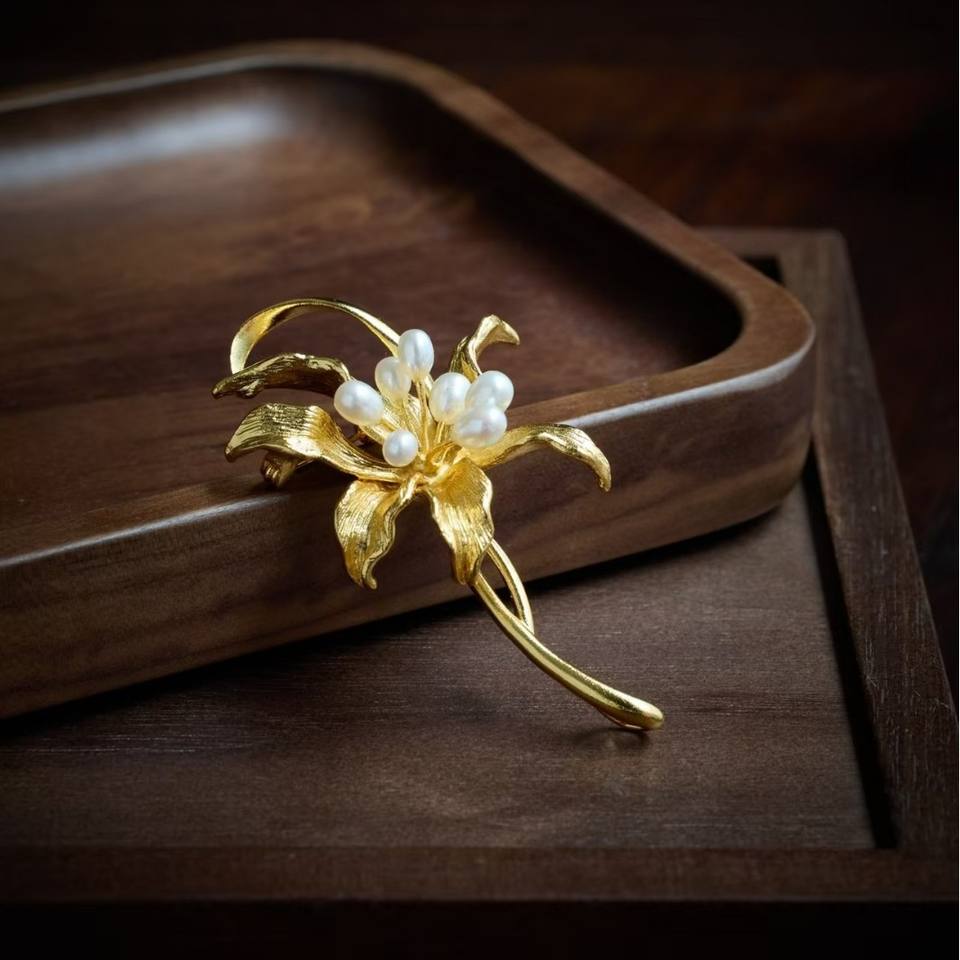 Golden Lily Vintage Chinese Style Palace Jewelry Freshwater Pearl Brooch with Chest Flower Pin Versatile Number Pattern Jewelry