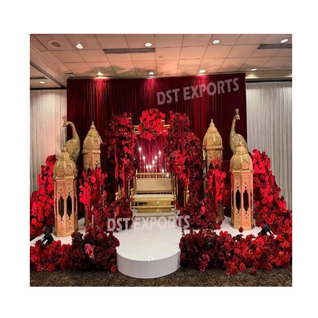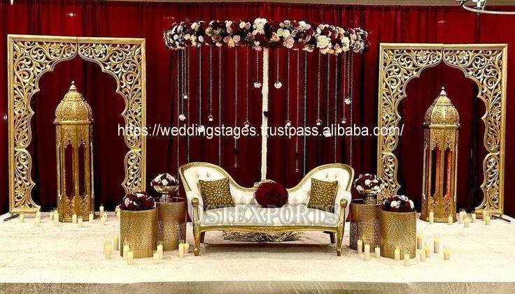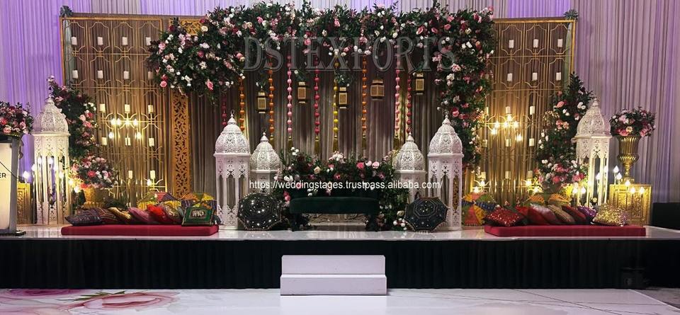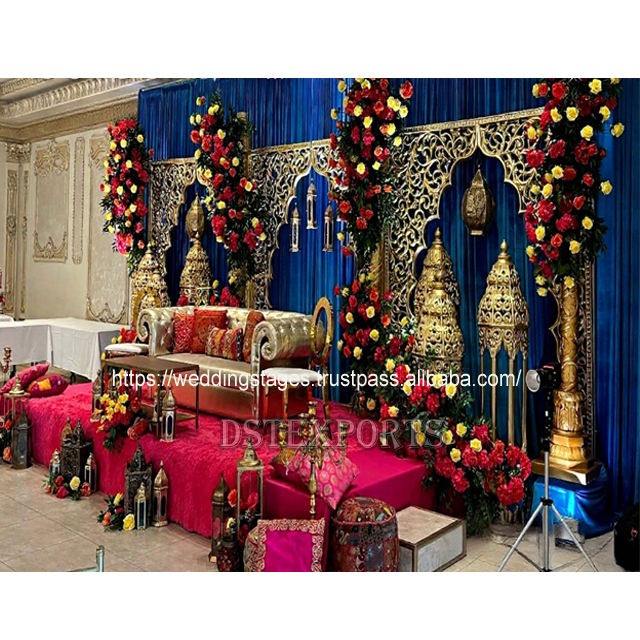 Lampes marocaines dorées pour décor de scène Walima DstExports scène de balançoire de mariage avec décor de lampe marocaine configuration indienne traditionnelle au Royaume-Uni