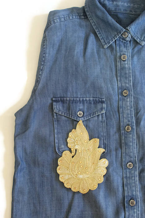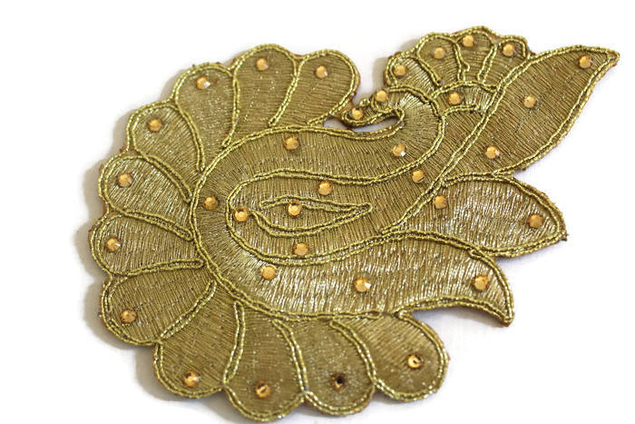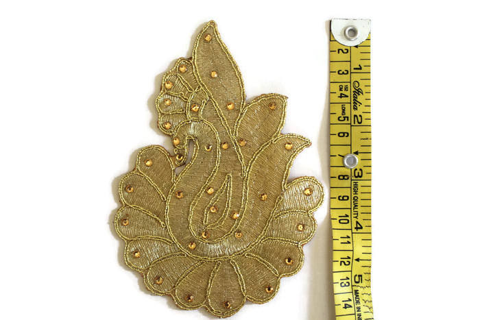 Patch d'Applique Brodé de Paon Zari Doré Fabriqué à la Main Ethnique Motif de Paon Pierres Tissu Perles pour Sarees Sacs Artisanat