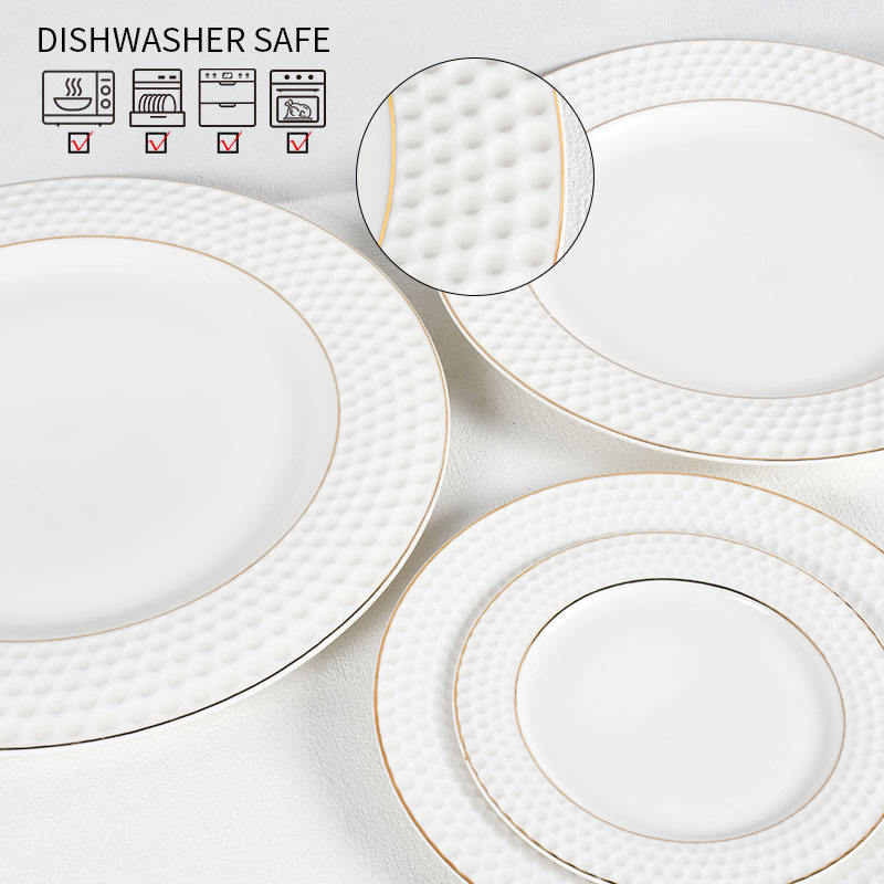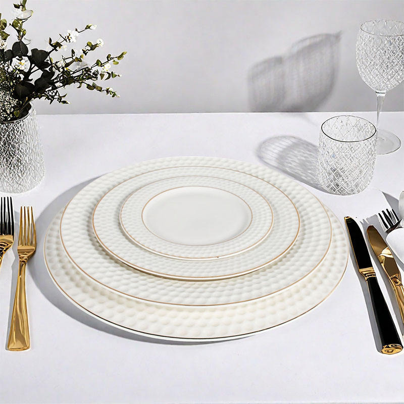 Ensemble d'assiettes en céramique alvéolées de qualité commerciale 6/8/10,5/12 pouces, blanc et or, vaisselle en gros pour restaurants avec design antidérapant