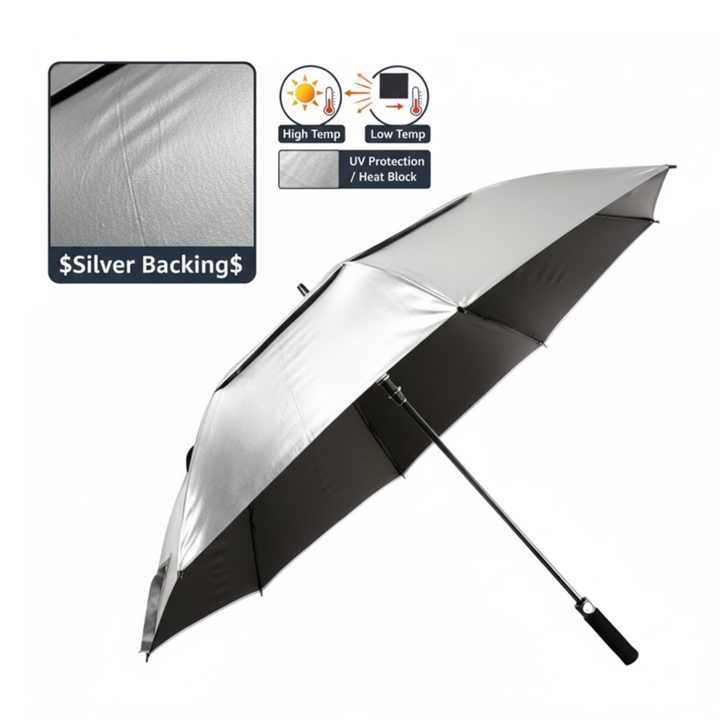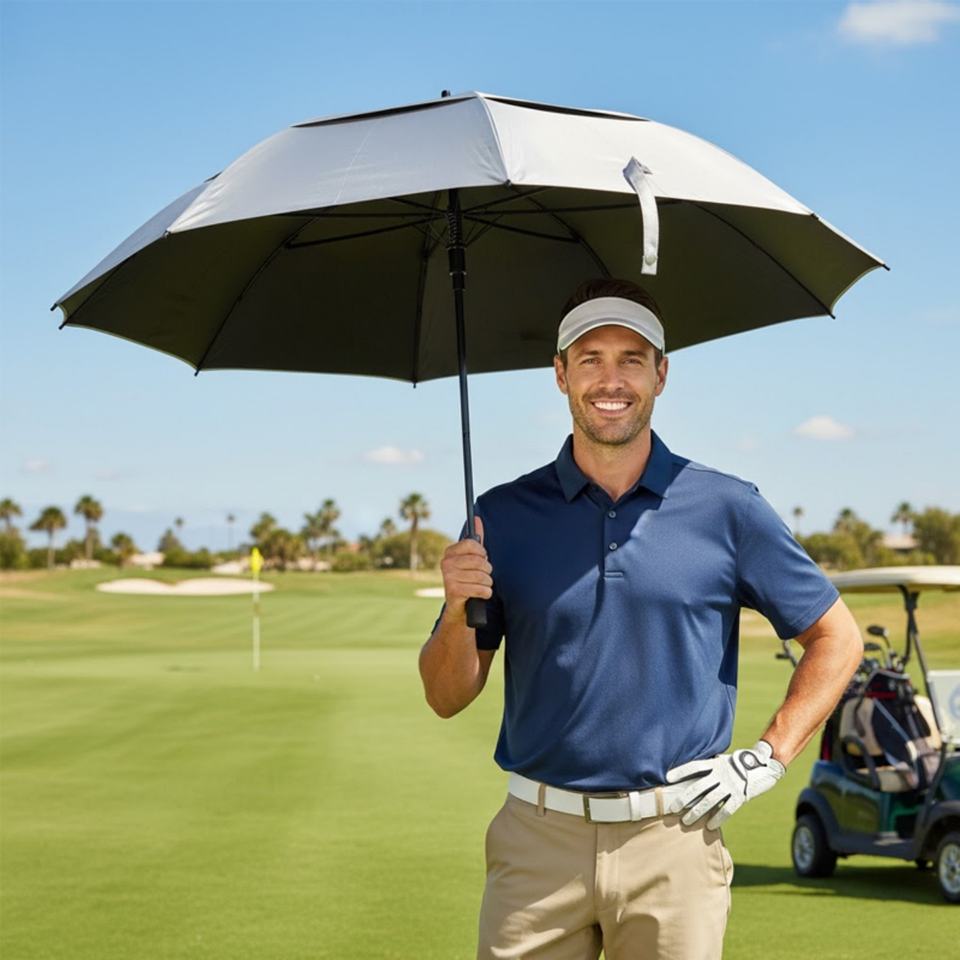 Parapluie de golf avec dos argenté, armature en fibre de verre, robuste, ventilé, protection anti-UV, poignée droite, personnalisé, surdimensionné 190T
