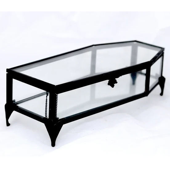 Beau cadre en laiton noir mat fait à la main boîte de rangement en forme de cercueil boîte en verre de luxe utilisation à la maison bijoux indiens en métal