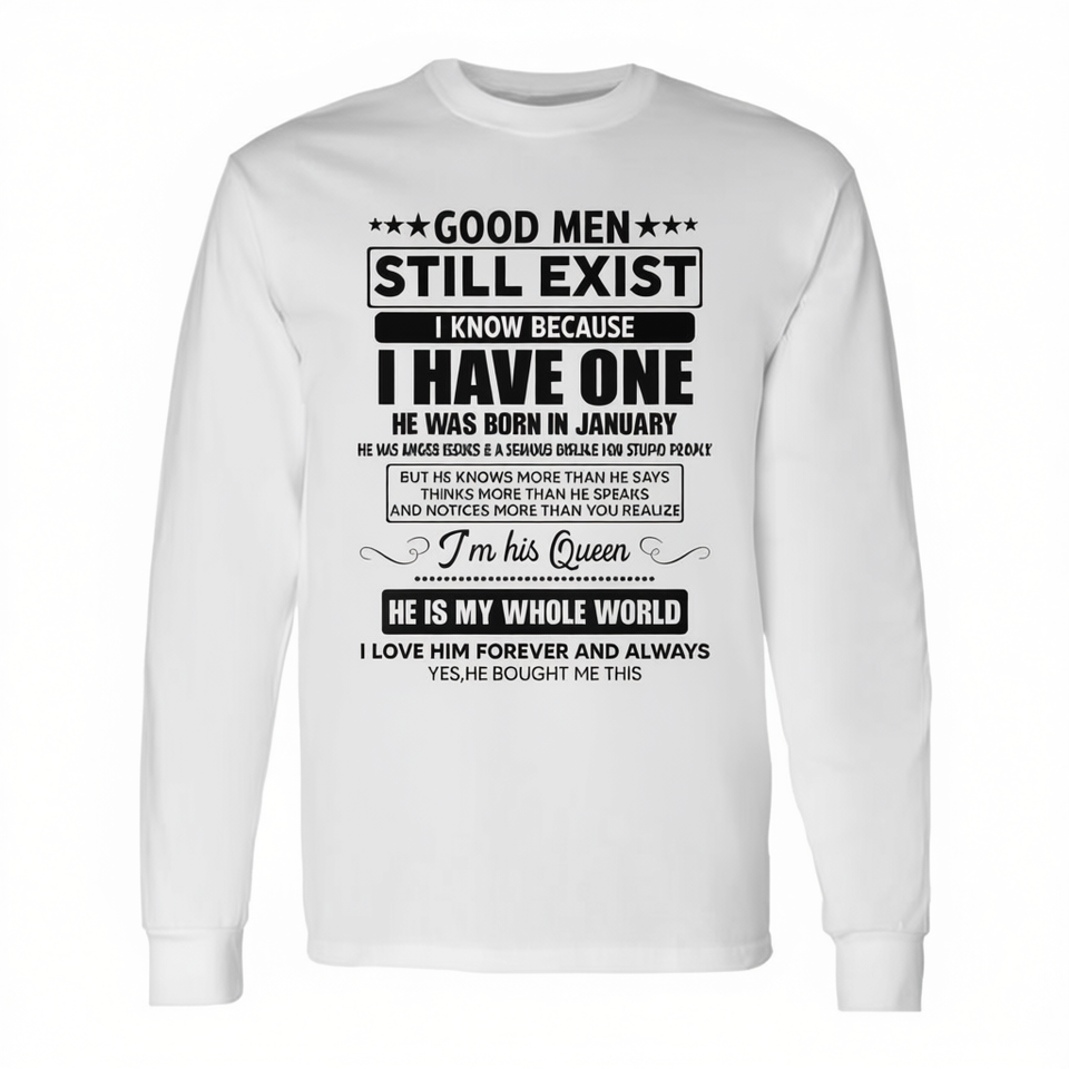 Les bons hommes existent encore, il est né en janvier, t-shirt à manches longues, cadeau d'anniversaire pour elle