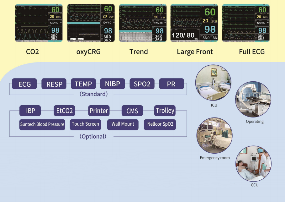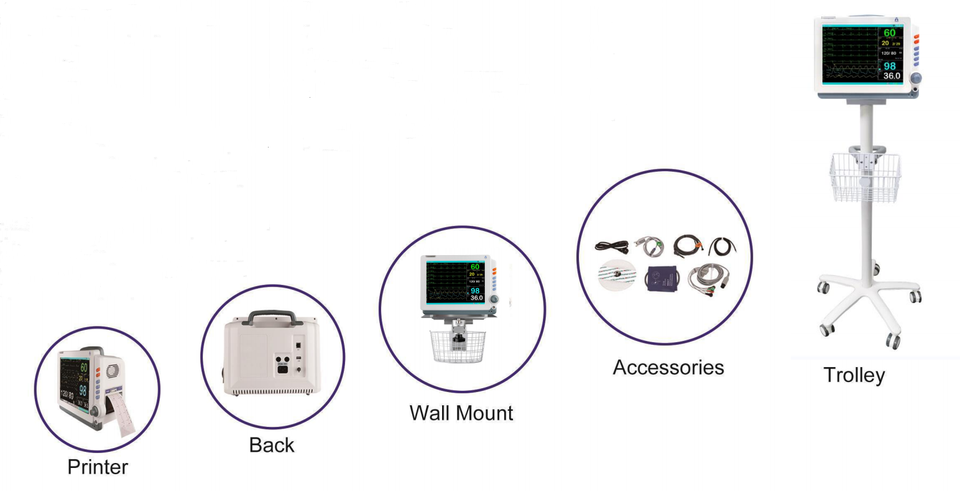 Paramètres facultatifs:Écran tactile, 2-IBP, Etco2, Imprimante, CMS, Support, Montage mural