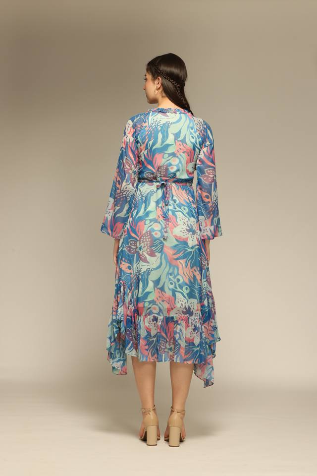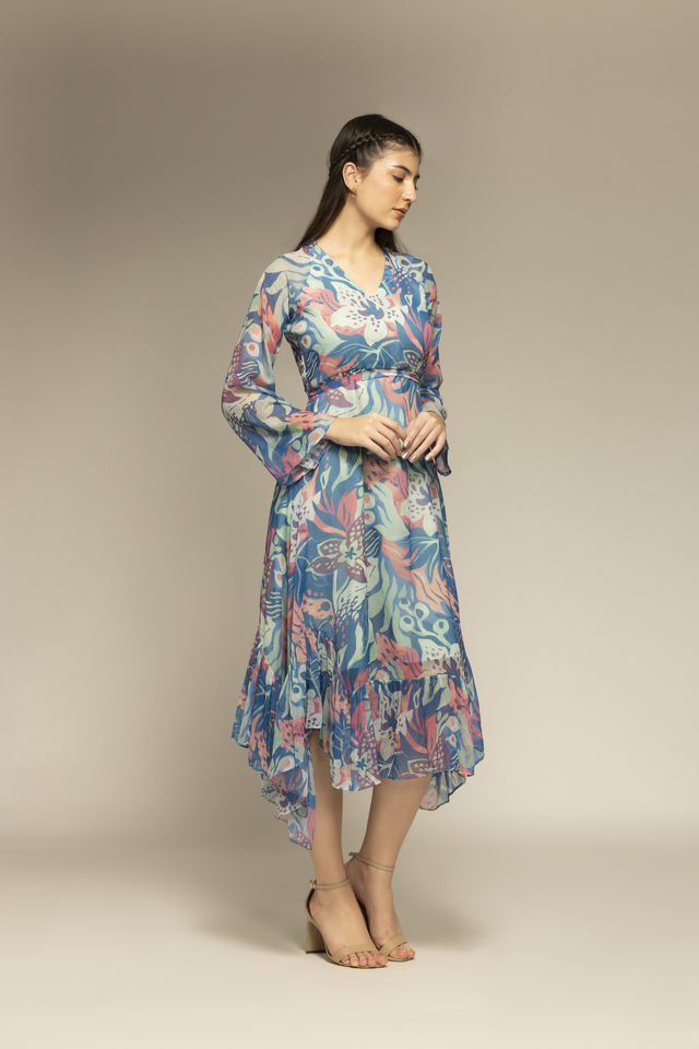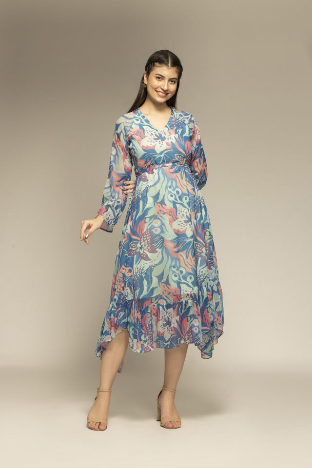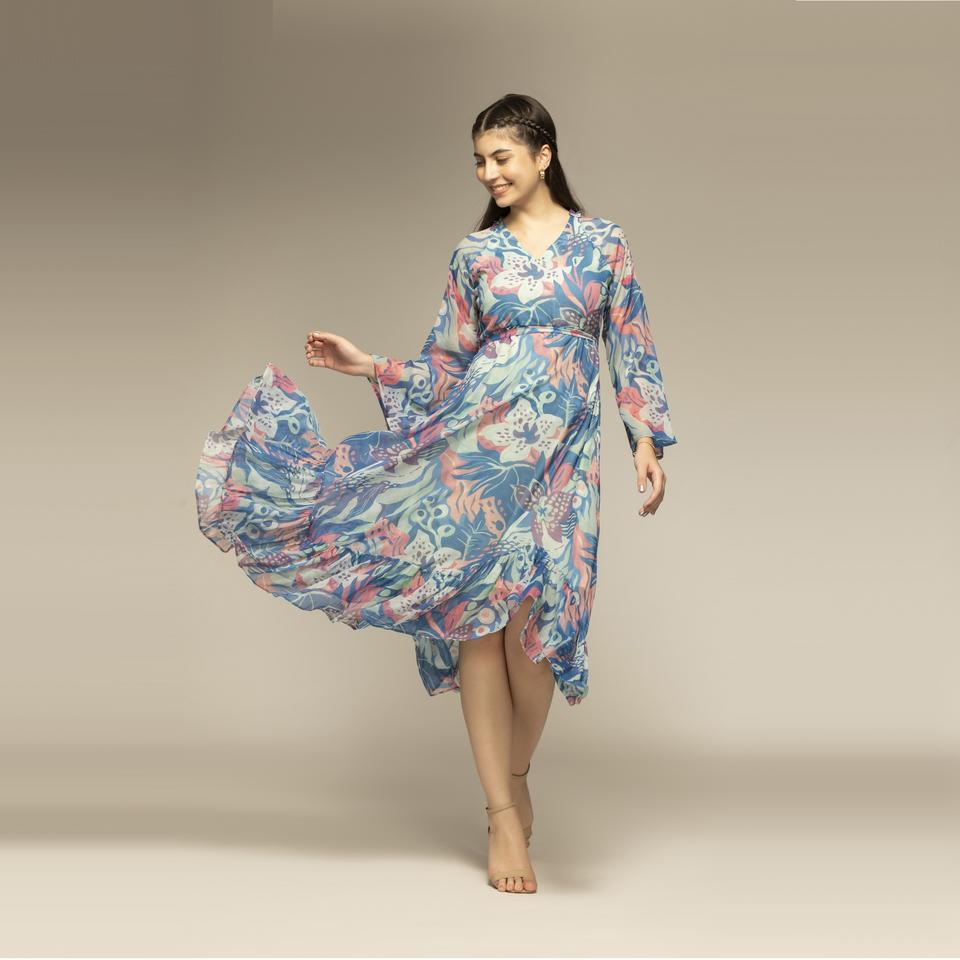 Robe longue à imprimé floral bleu de bonne qualité avec manches longues et col en V pour femmes, robe de créateur disponible en quantité en gros