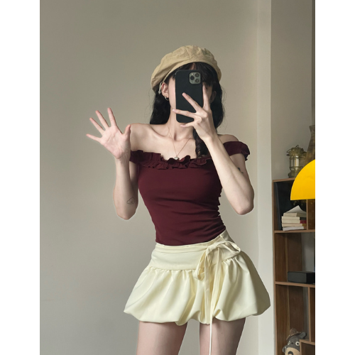 T-shirt Premium Femme Grande Taille en Coton Compressé Coupe Slim Style Coréen Naturel Féminin avec Volants et Col Bardot de Bonne Qualité