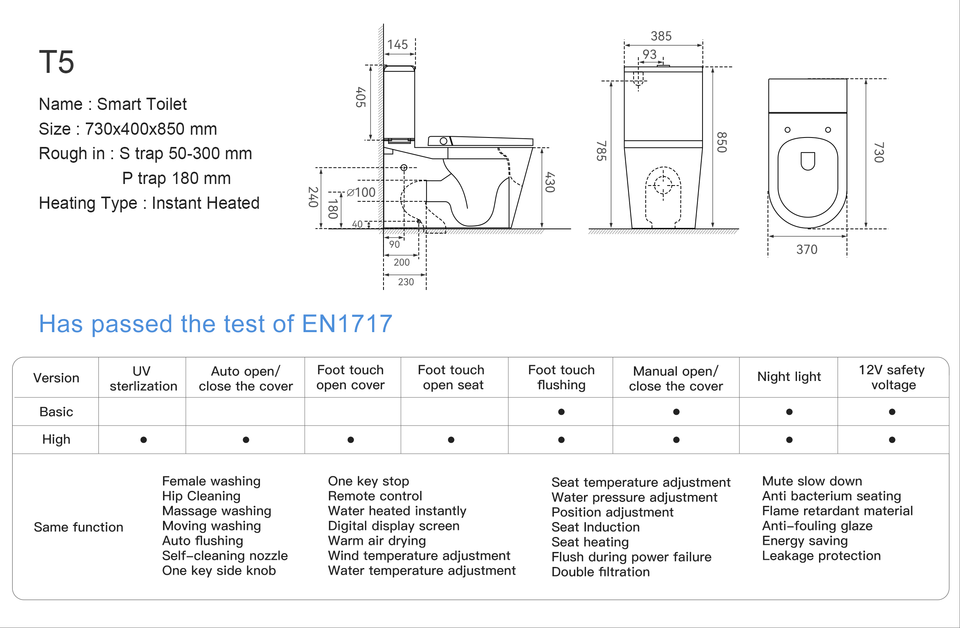 Fonction avancée:Buse autonettoyante, Lave-femme, Sesiège de chauffage, Séchage à l'air chaud, Type de chauffage instantané, Télécommande, Lavage de Fesses, Réglage de la pression de l'eau, Réglage de la température de l'eau, Nuit lumière, Mode enfants