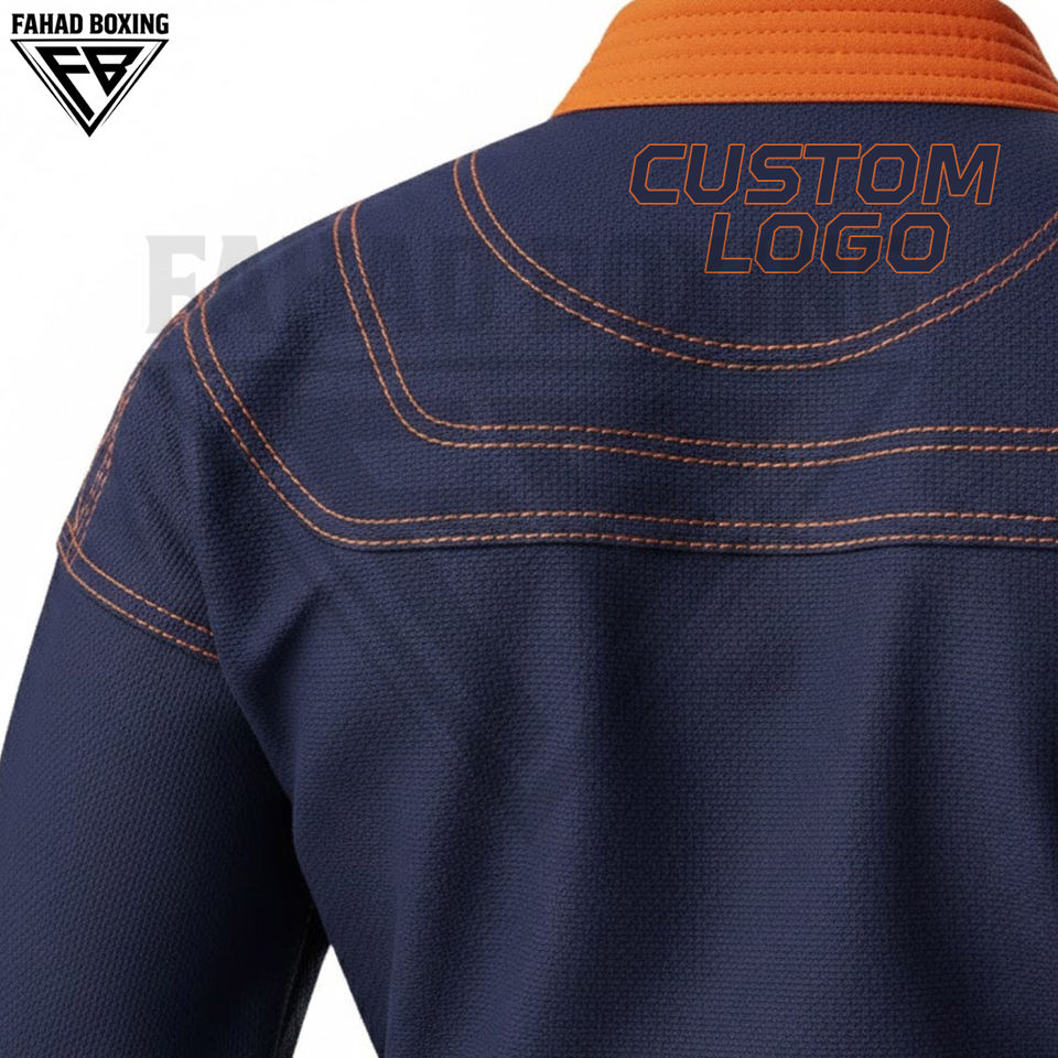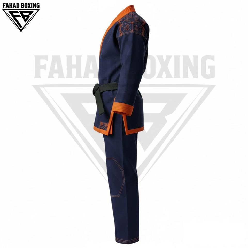 Tenue de karaté et arts martiaux personnalisée avec imprimé contrastant bleu marine et bordure orange de sécurité, respirante et légère en polyester