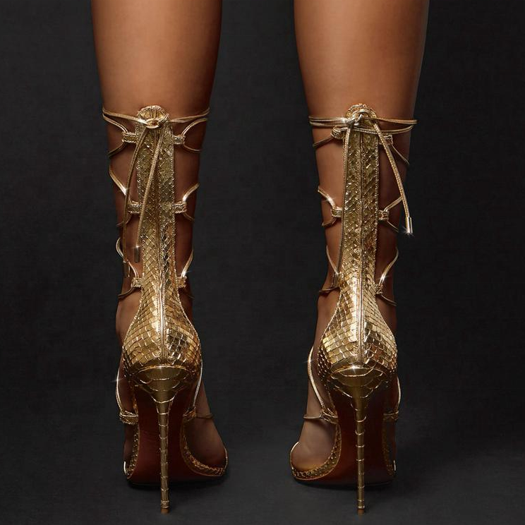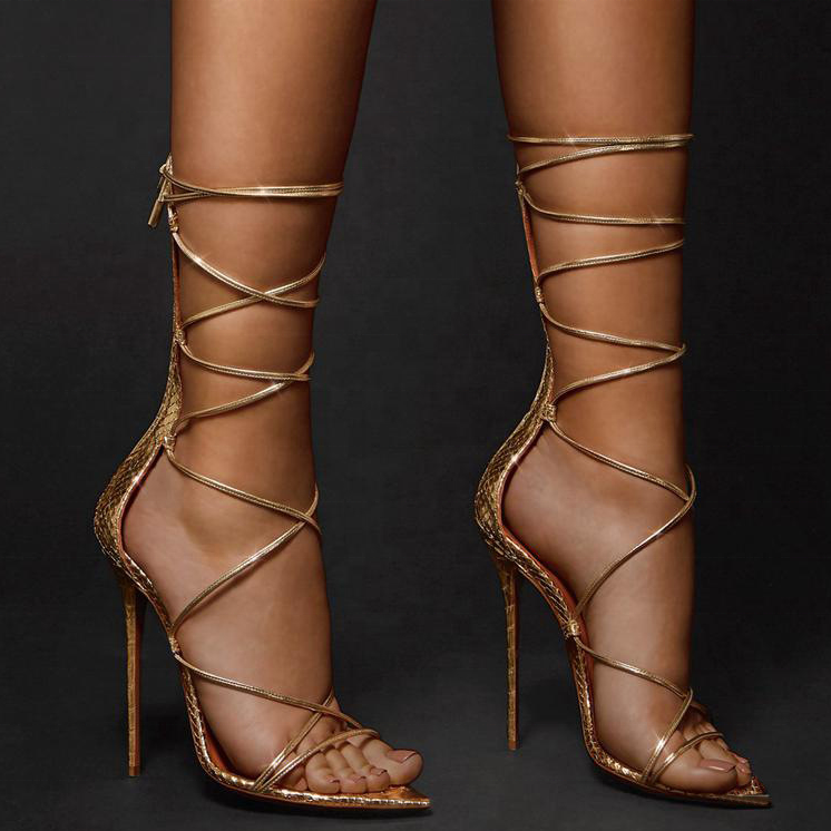 Sandales pour femmes à bout pointu et motif élégant, talon fin, bride étroite, à lacets, chaussures habillées d'été pour femmes, grandes tailles 45