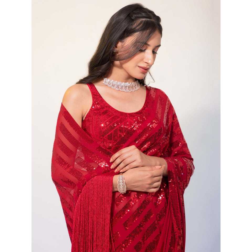 Magnifique sari de soirée en georgette rouge à paillettes avec chemisier non cousu Zeel Clothing