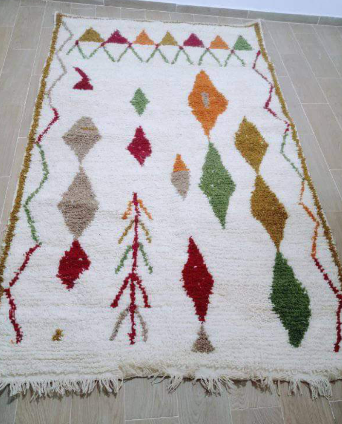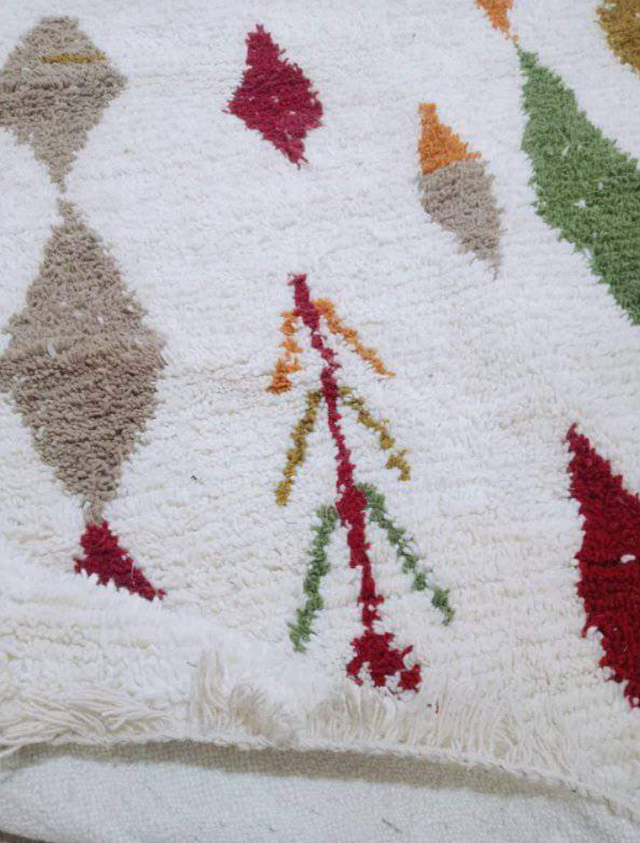 Mode:Magnifique tapis blanc Beni Ourain en laine avec des motifs colorés