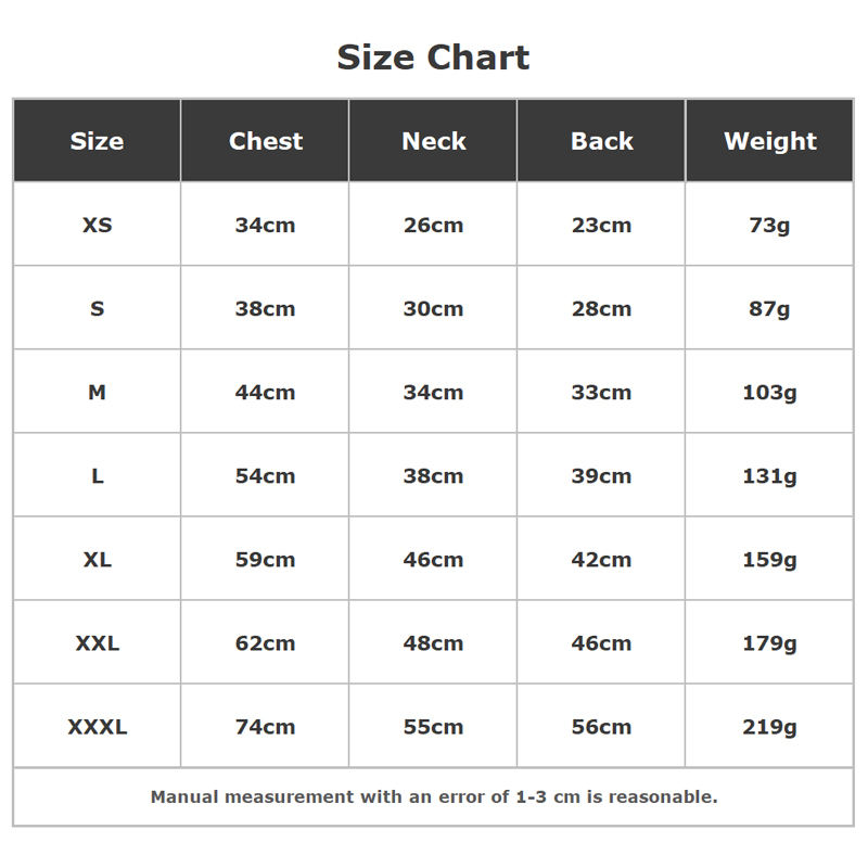 Weight:XS-73g, S-87g, M-103g, L-131g, XL-159g, XXL-179g, XXXL-219g