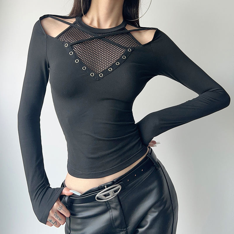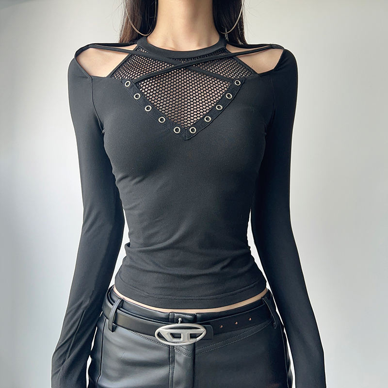 Haut gothique noir à épaules dénudées avec empiècements en maille, haut ajusté à manches longues avec détails œillet, streetwear punk Y2K pour femme