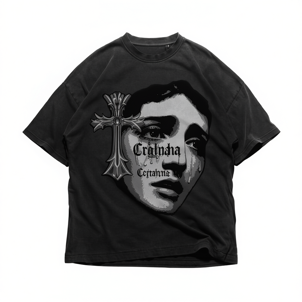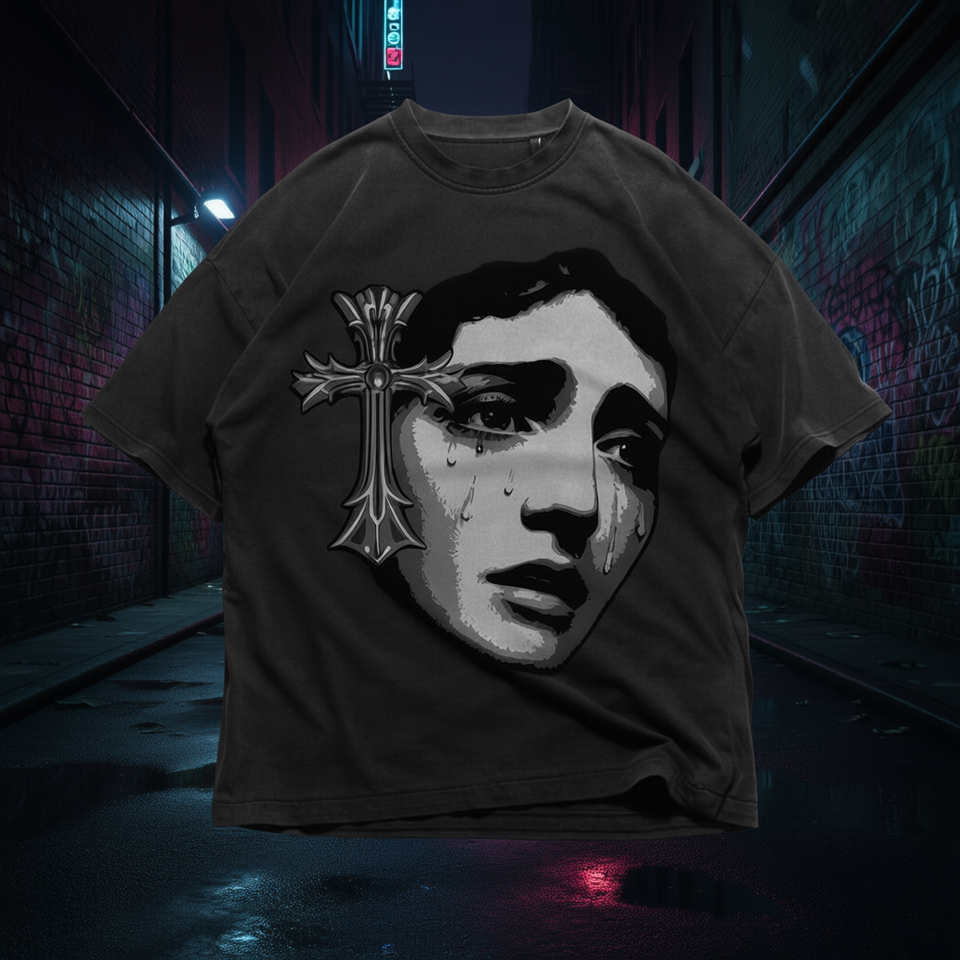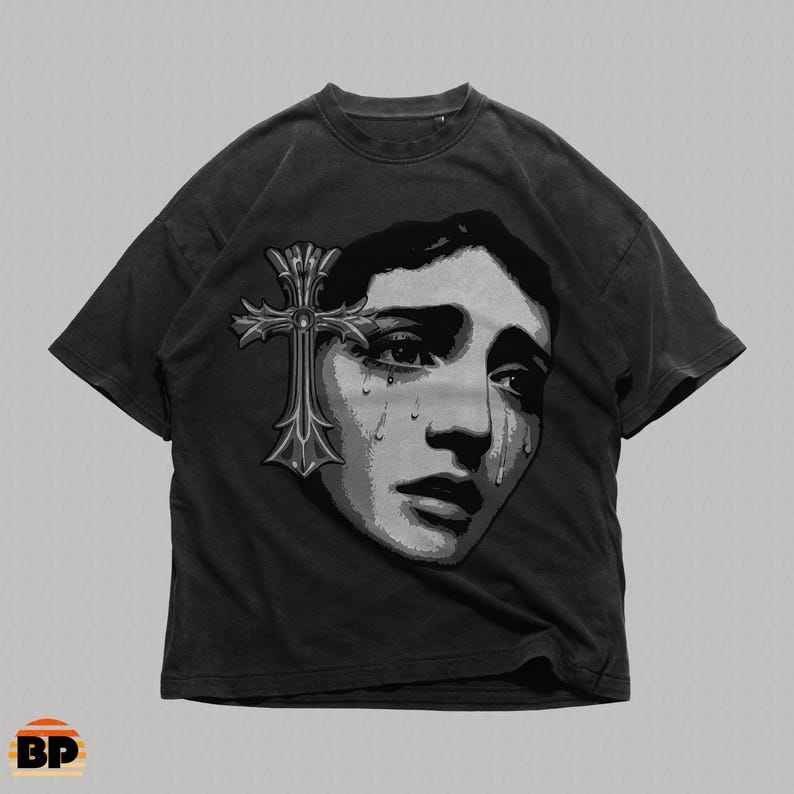 T-shirt graphique surdimensionné style streetwear années 90, motif Croix de la Madone pleurante gothique, esthétique sombre, style vintage