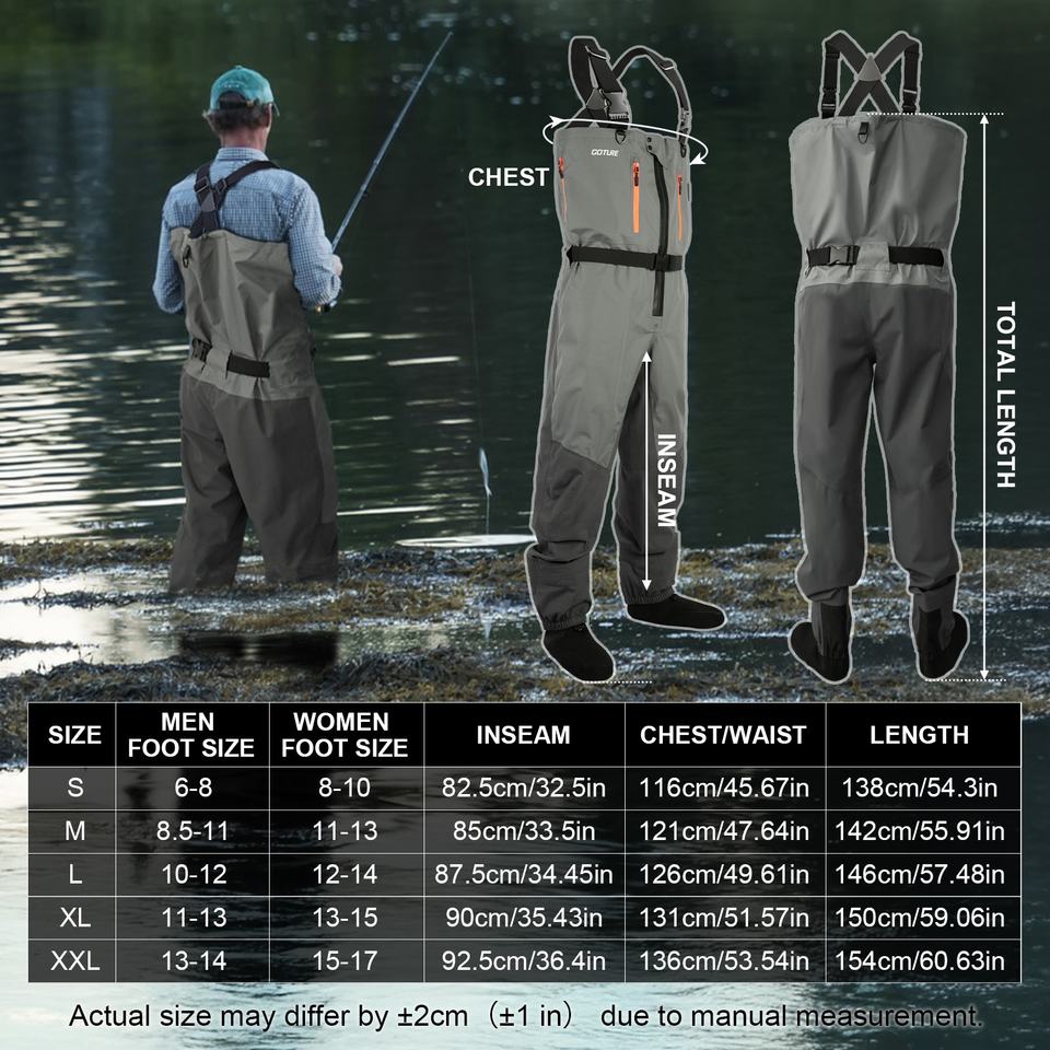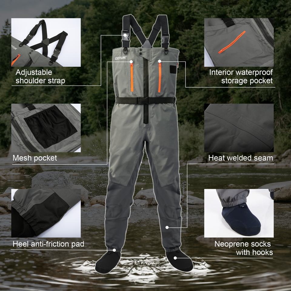 Goture 5-Layer Waterproof Stocking Foot Waders Breathable Fly Fishing Waders for Men Multiple Storage Pockets 5 Sizes