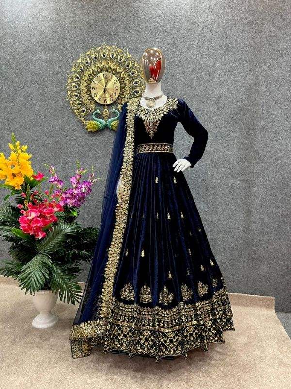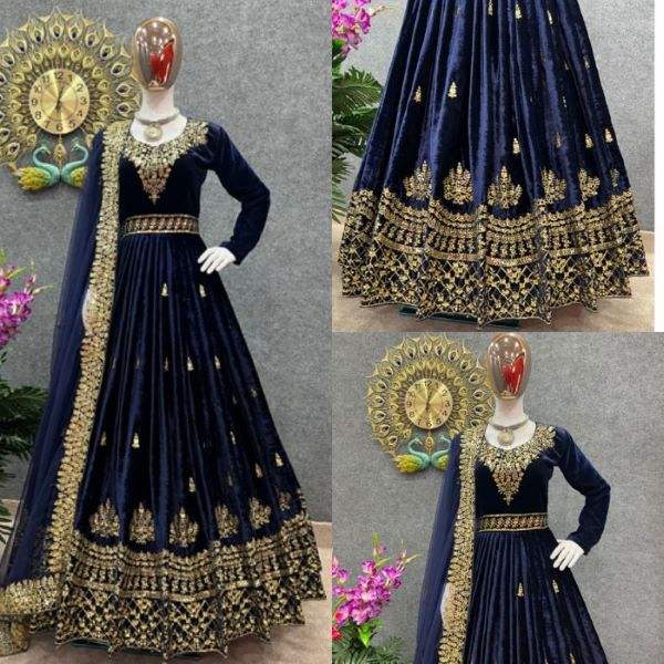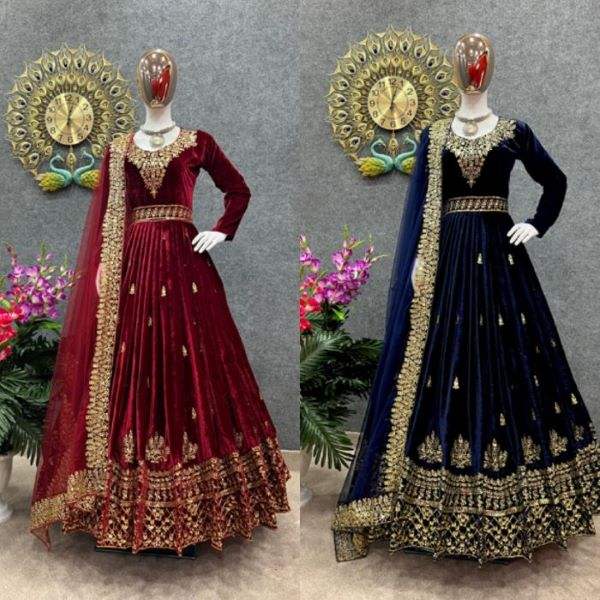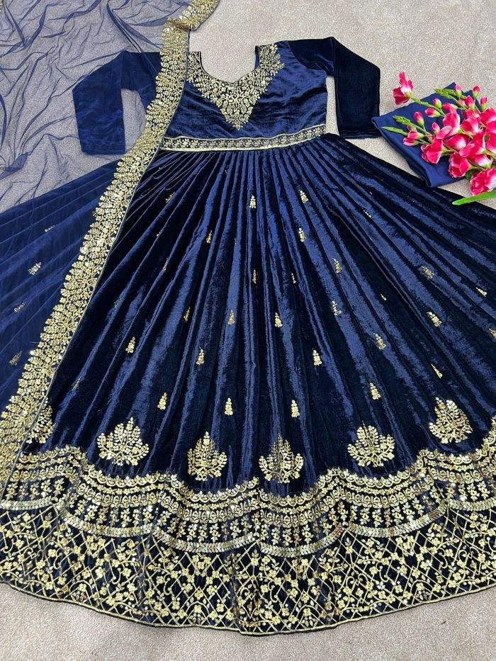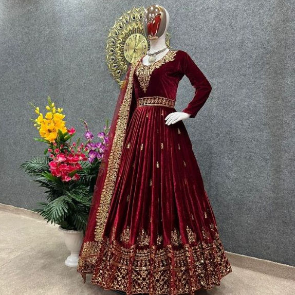 Tissu de robe en velours lourd avec broderie et travail de sequins, manches longues, robe de créateur longue, tissu de dupatta en filet