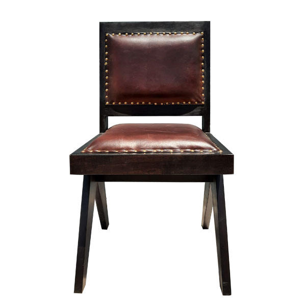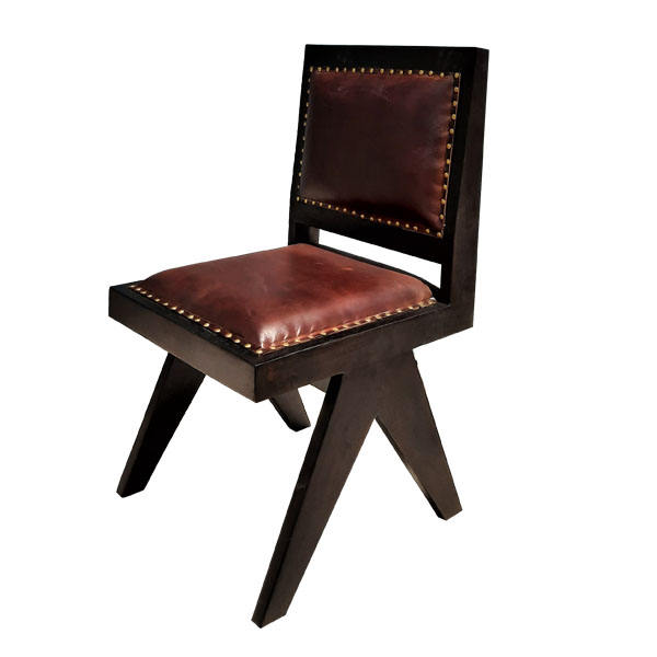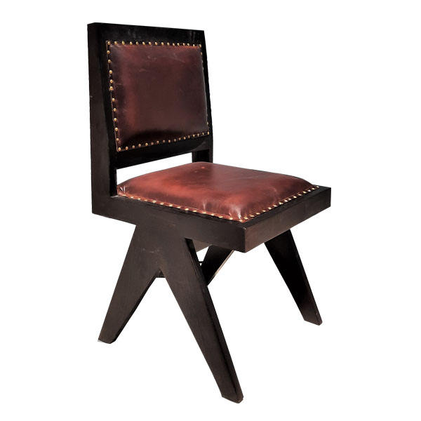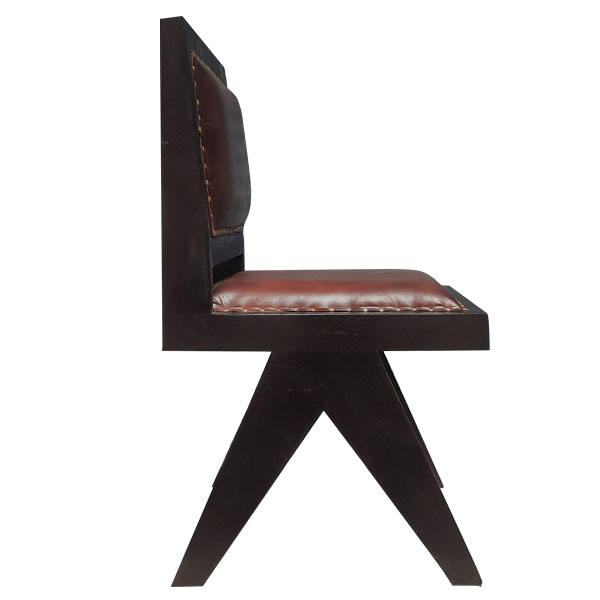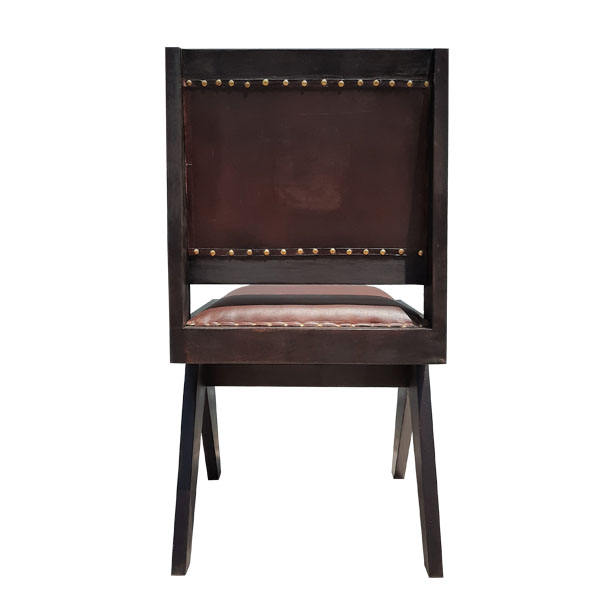 Chaise de salle à manger rustique Grace en teck massif et assise en cuir PU avec finition noyer pour une utilisation en salle à manger intérieure.