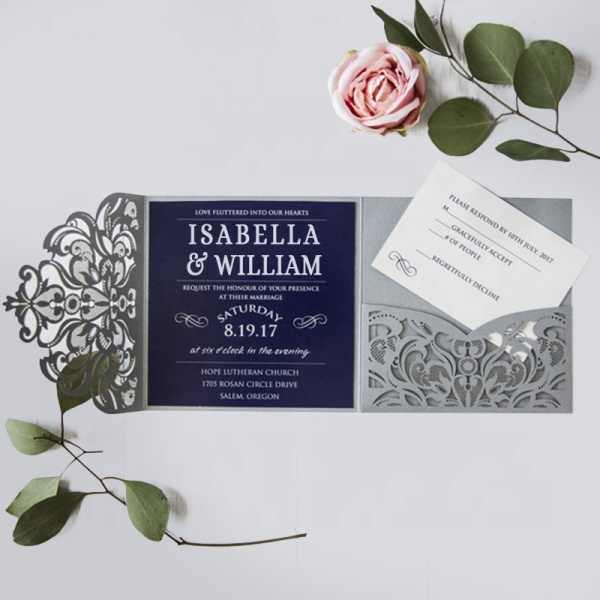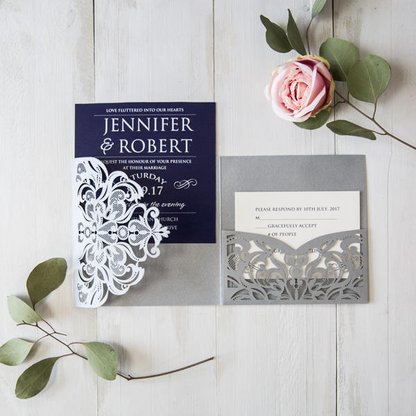 Invitations de mariage de dossier de poche à trois volets bleu marine et argent découpées au laser florales gracieuses