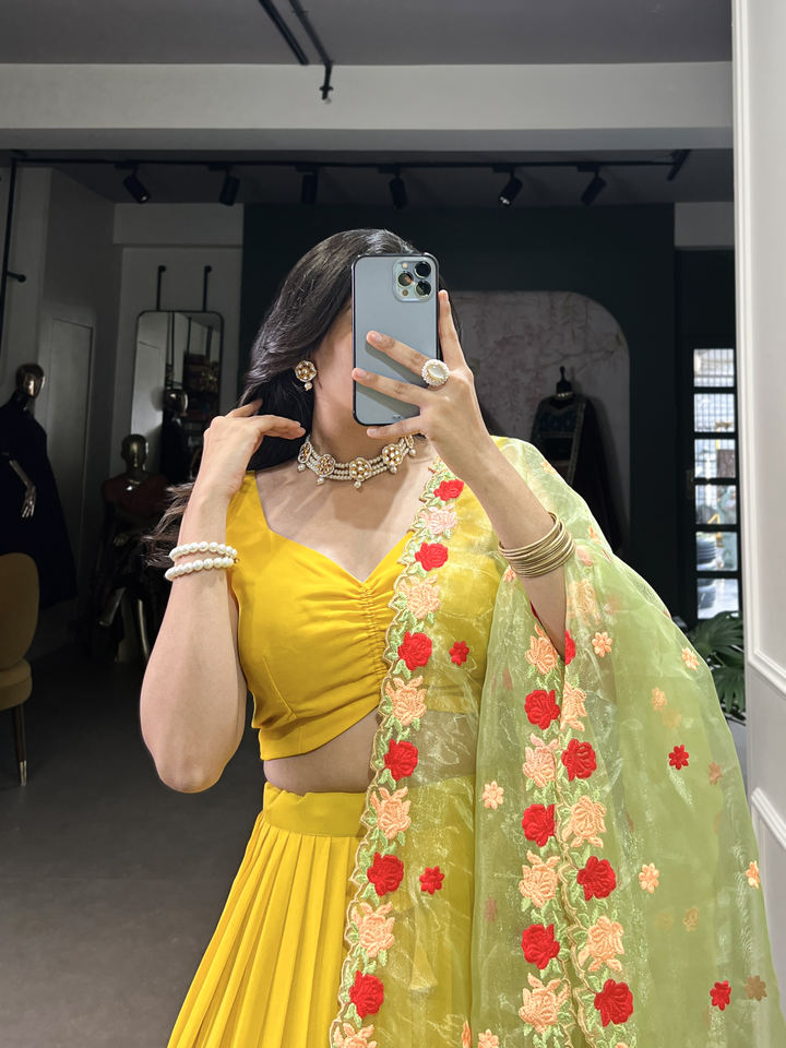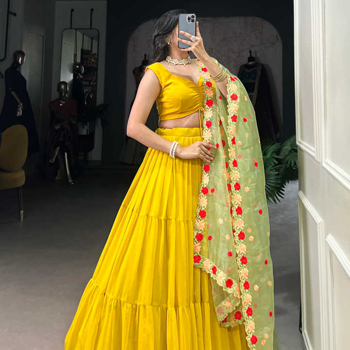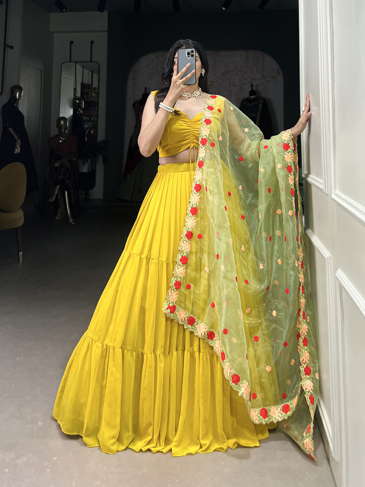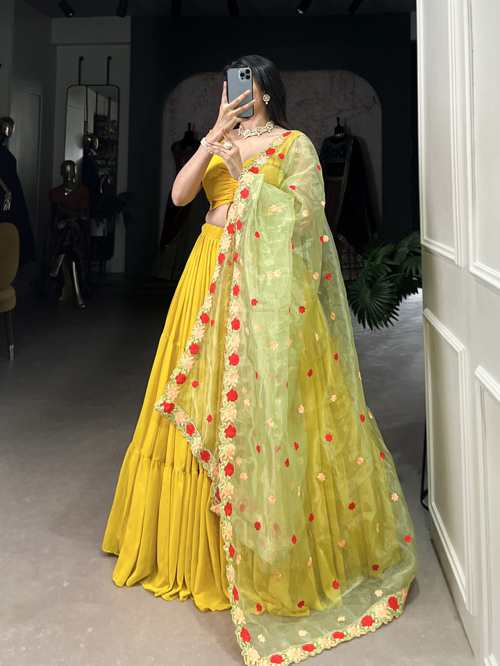 Georgette gracieuse plaine Lehenga avec organza brodé Dupatta et chemisier réglable toile point fête porter ensemble