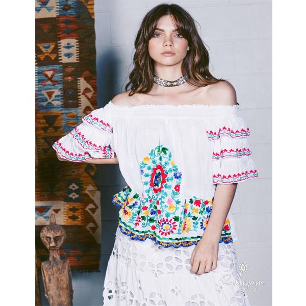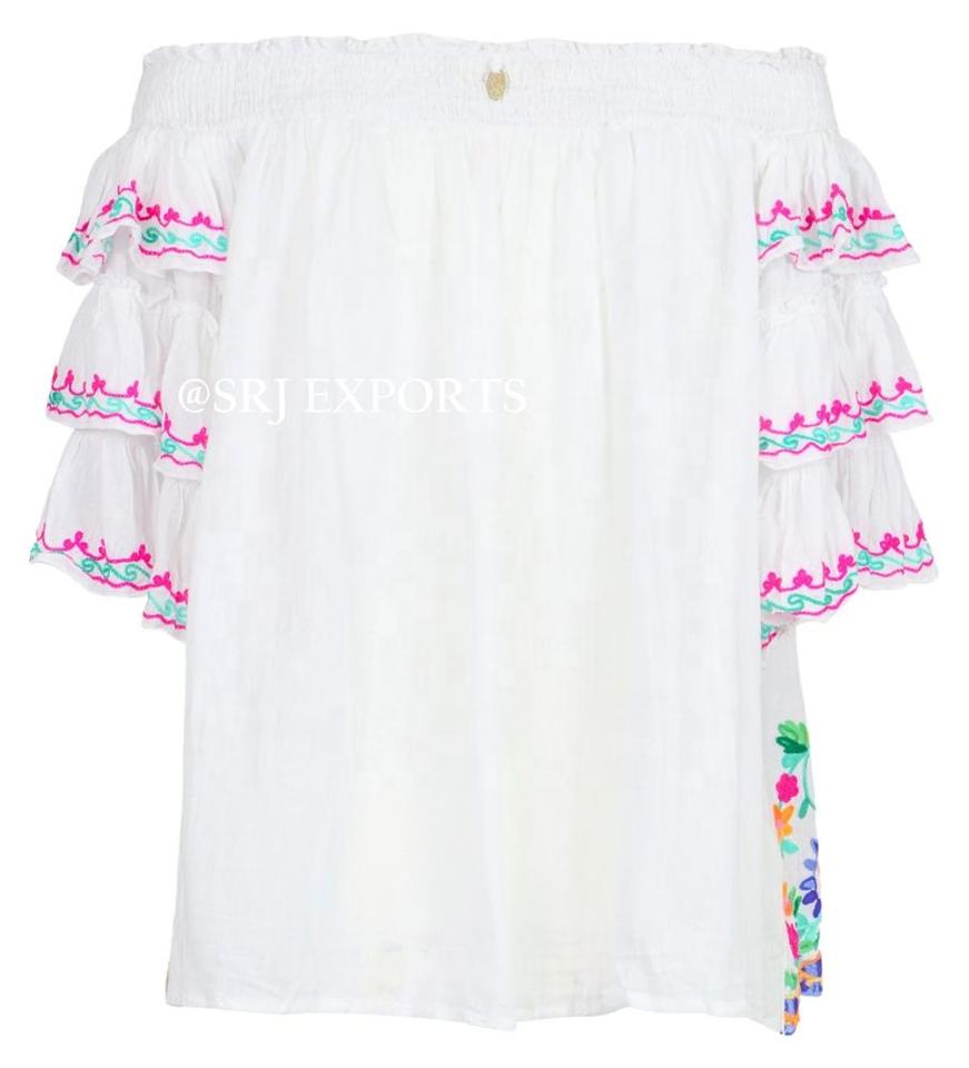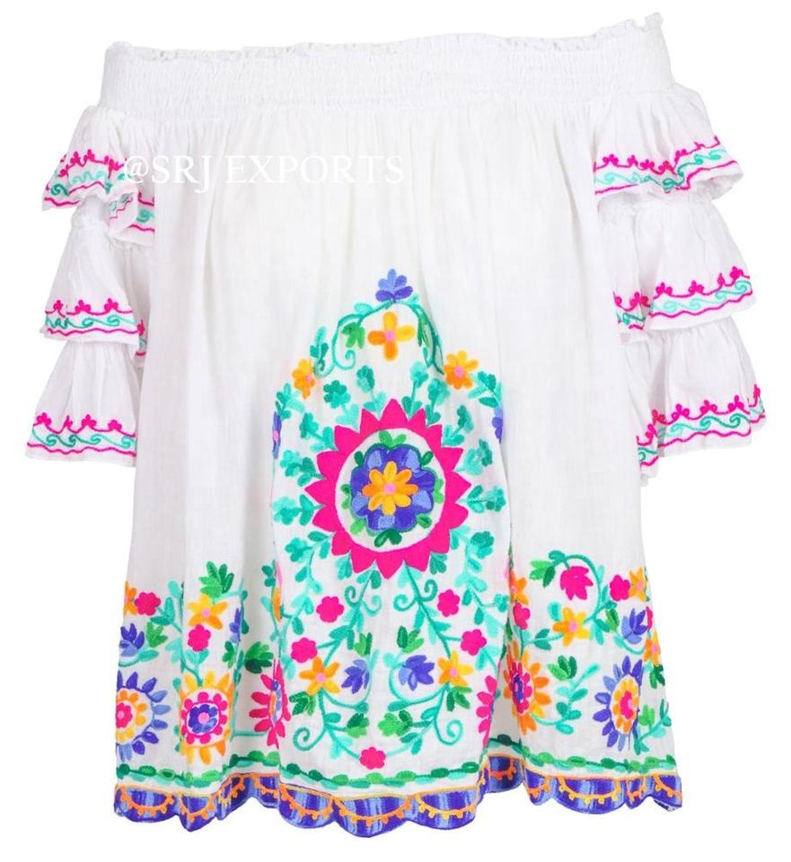 Top à épaules dénudées en coton 100% avec un design élégant et sexy, bande élastique large, broderie colorée magnifique, manches à volants larges