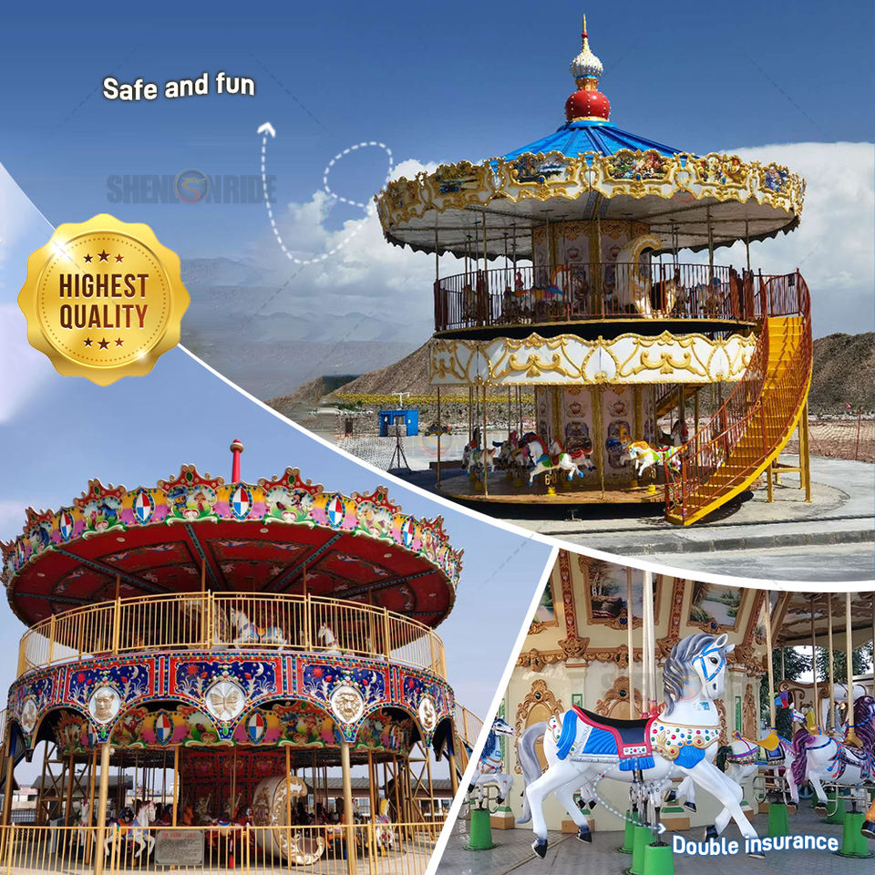 Grand carrousel en bois sculpté avec 30 chevaux et jeu d'anneaux en laiton