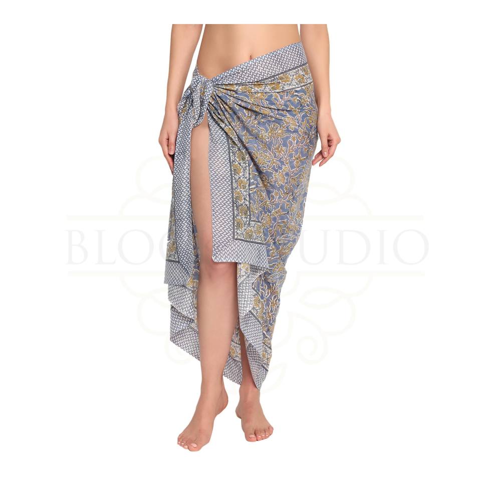 Paréo en coton imprimé à la main gris granit et moutarde pour femme, léger, idéal comme cache-maillot de bain, pour la plage et les vacances d'été