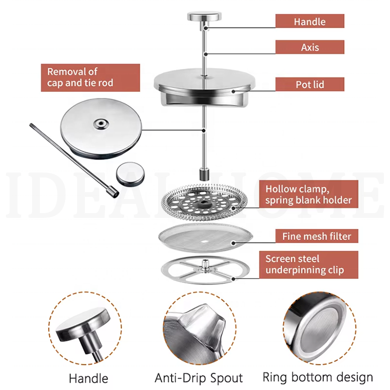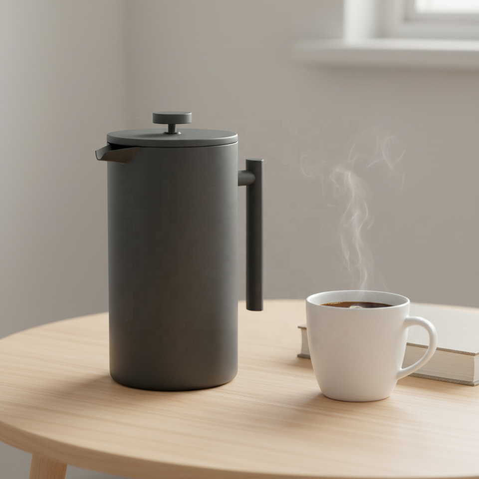 Cafetière à piston double paroi 34 oz avec revêtement gris et logo personnalisé, en acier inoxydable 304