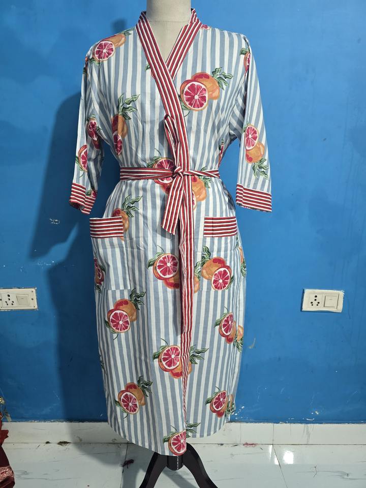 Robe kimono en coton gris à imprimé fruité pour femme, demoiselle d'honneur, été automne, respirante, imprimé artisanal, cadeau fait main