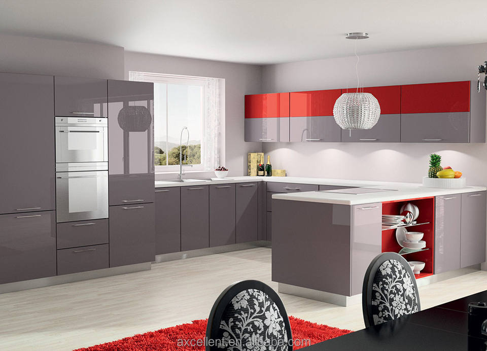 Meuble de cuisine modulaire gris brillant en résine, design moderne, avec poignée, pas cher, pour micro-ondes et placard