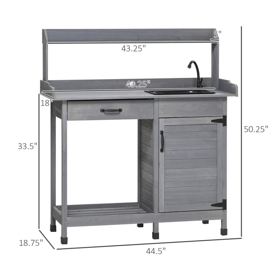 Table de banc d'empotage extérieur gris avec robinet d'évier et tiroir pour patio de jardin pour le stockage de la serre