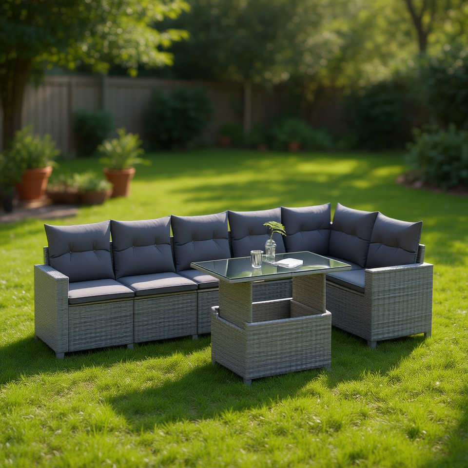 Ensemble de canapés de jardin en rotin gris, structure en acier, verre trempé, mobilier d'extérieur, design contemporain, 6 places