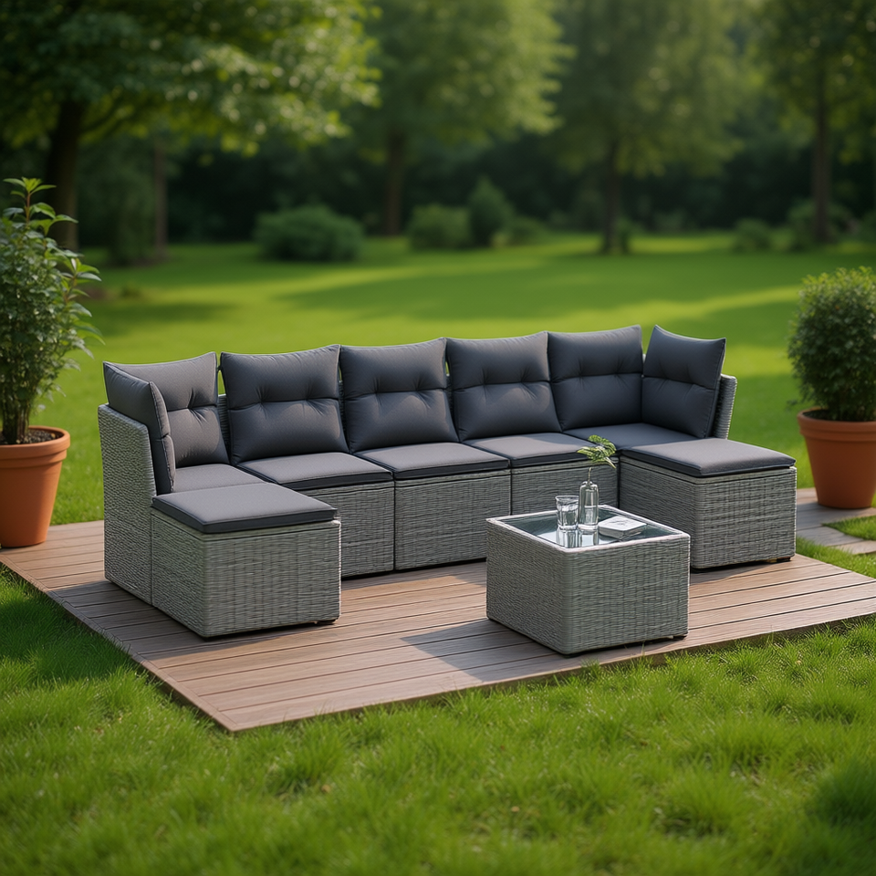 Gray Pe Rattan Garden Sofa Set With Tempered Glass 6 Seater Outdoor Furniture Contemporary Design